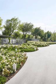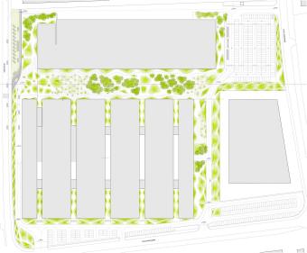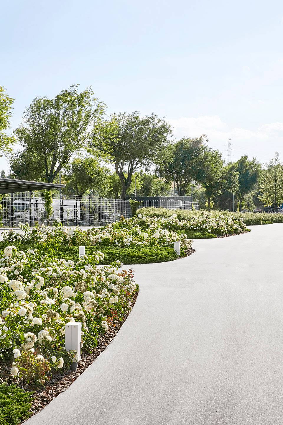 綠地同時“包圍著”建筑物,且根據(jù)每棟建筑物的朝向,分低矮植被區(qū)和森林區(qū)環(huán)列四周。每塊綠地/沙丘都擁有不同地形,將平坦的灰色場地轉(zhuǎn)換成布滿沙丘和小山谷般的綠色景觀。集中在地塊入口處的一期工程業(yè)已完工,項目面積共計14448m2。