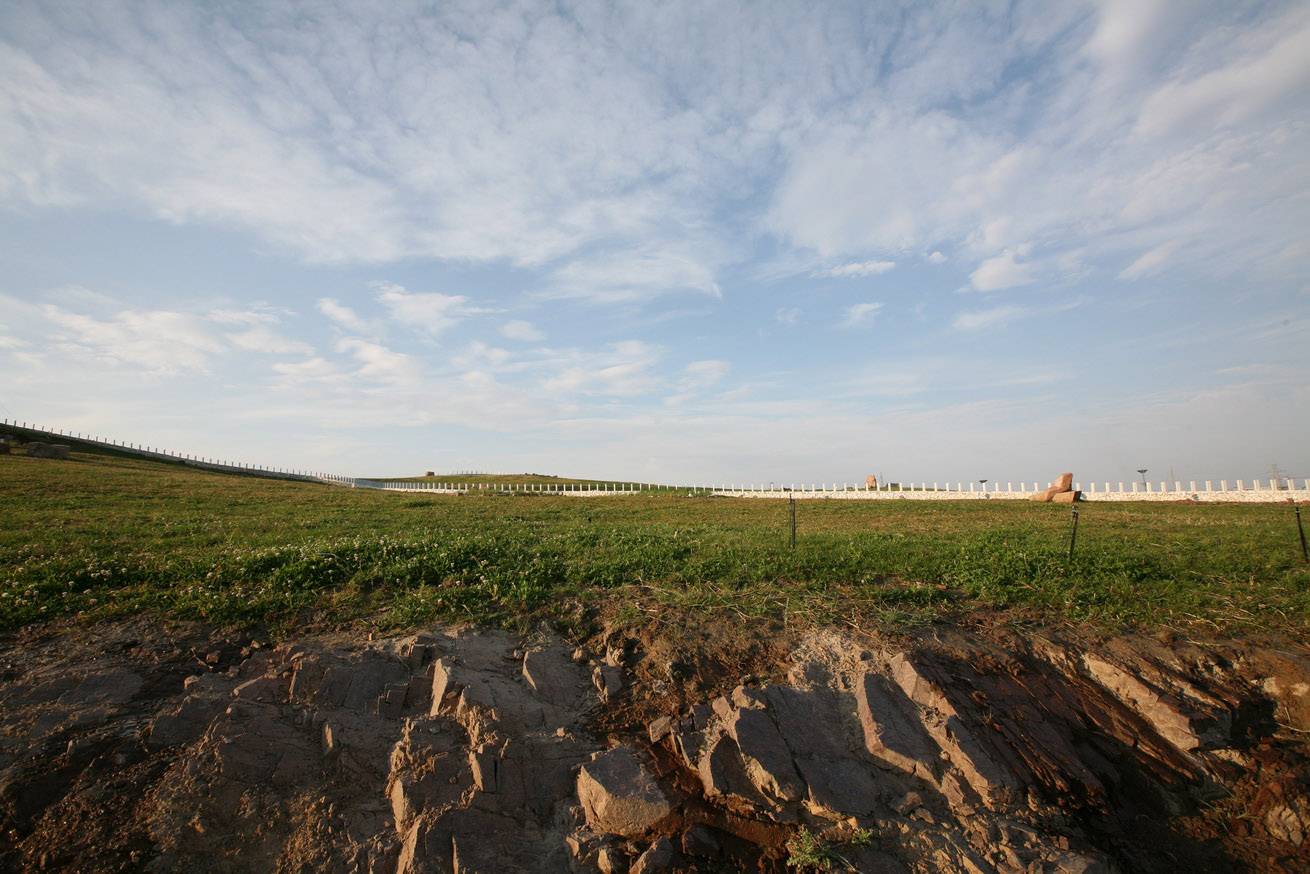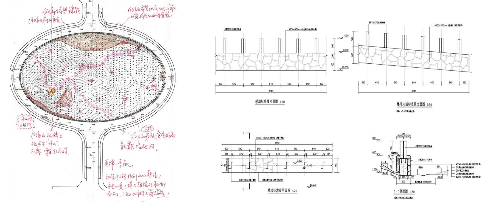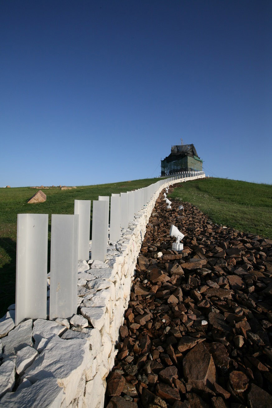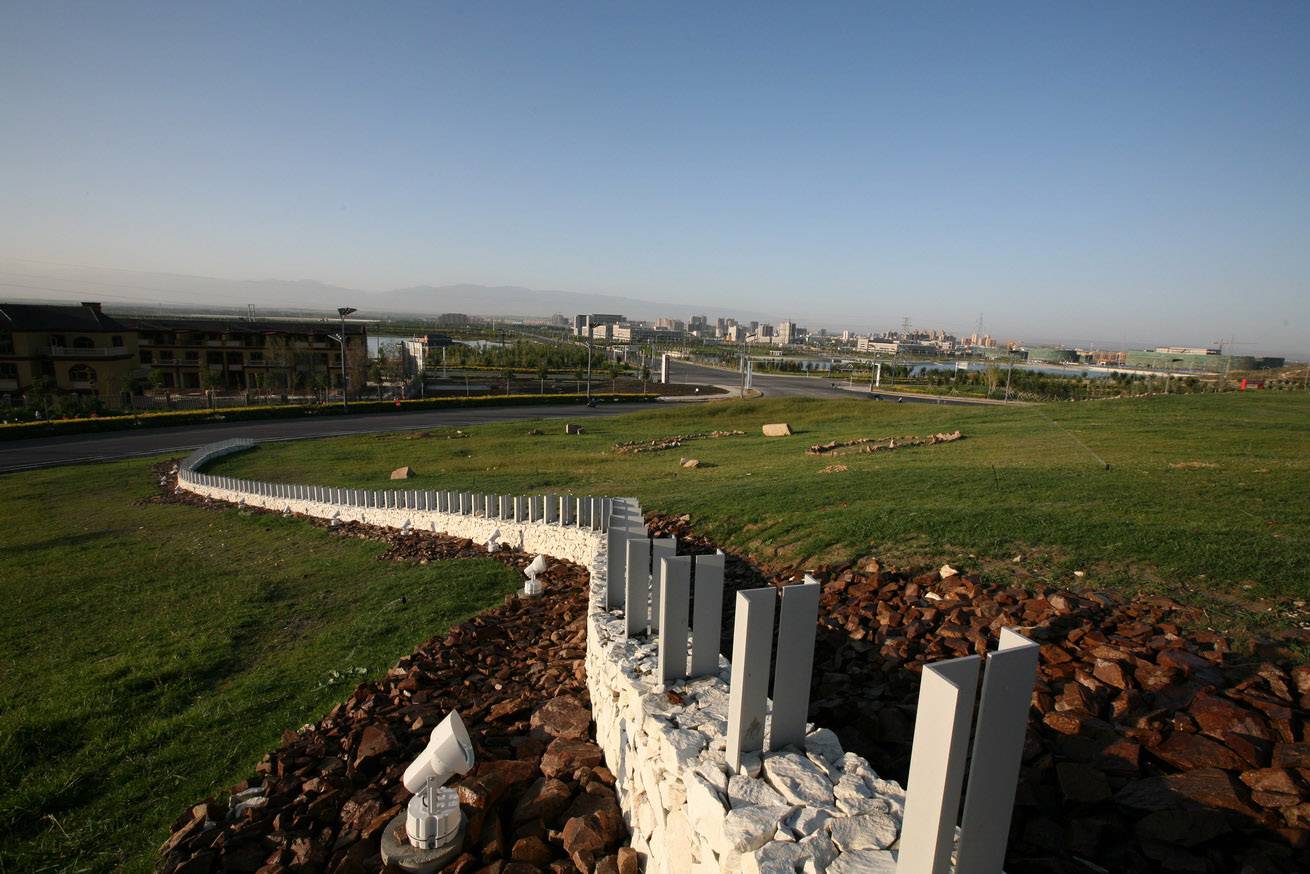 最后,在山體的東西兩側(cè)與最高峰的半山腰局部炸開山體,更好的挖掘和展現(xiàn)出石山的無限魅力。北側(cè)自然山體石壁間的旱生植被,裝飾了稍顯單調(diào)生硬的石壁,彰顯生命力的強(qiáng)勝;點綴在滿山的狼尾草、針芧、馬蘭等旱生地被,追溯了本地區(qū)特有的大自然情懷;遍布山體的散置石塊,實現(xiàn)了世上一切萬物的圓滿回歸;兩條金屬帶下方向的石墻延承了牧民日常生活畫卷;隨墻延伸的寬窄不一的外露山體,表達(dá)了人類留給賴以生存大地上的足跡;最高點的孤植密葉楊,再現(xiàn)了地區(qū)固有的美好景象。我們在創(chuàng)作初期就將此場所確定為:時間與秩序的解讀之場,并將空間營造的程度降至最低。唯一的操作——碎石疊墻也是希望更好的突出現(xiàn)狀到起伏山體形態(tài)。期待這里能成為城市居民的家園之感!設(shè)計中避免一切不必要的裝飾,追求隨時間變化表現(xiàn)出不同的表情,并形成場所特有的一種空間氛圍。和常規(guī)設(shè)計不同之處在于我們在這個場地上沒有刻意地去創(chuàng)造和表現(xiàn)設(shè)計師自己的意愿,只力求耐心地去培育這個場所。并通過細(xì)微的、甚至幾乎感覺不到細(xì)節(jié)的處理,確保空間形體,體量之間的關(guān)系不變。也就是說:表情、氛圍隨時間變化而不斷變化,但空間形體,體量關(guān)系卻始終爭取不變或者控制在最小程度的變。太空鋁板連接成的“哈達(dá)”、石塊干壘的“羊圍”、星星點點的旱生地被、常見但又不常規(guī)的“密葉楊”、自然裸露的山體石壁等無不期待更充分地表達(dá)—-場地的“時”與“序”。