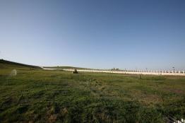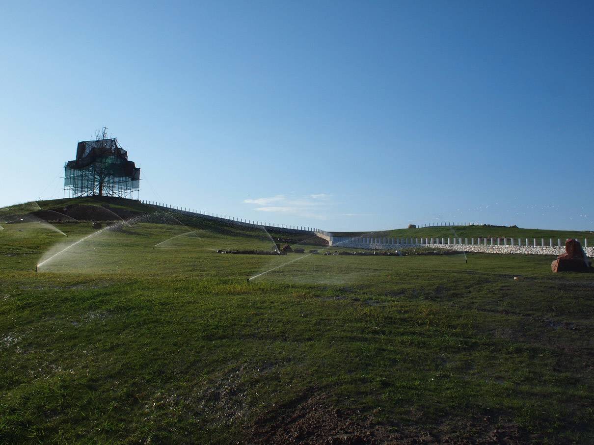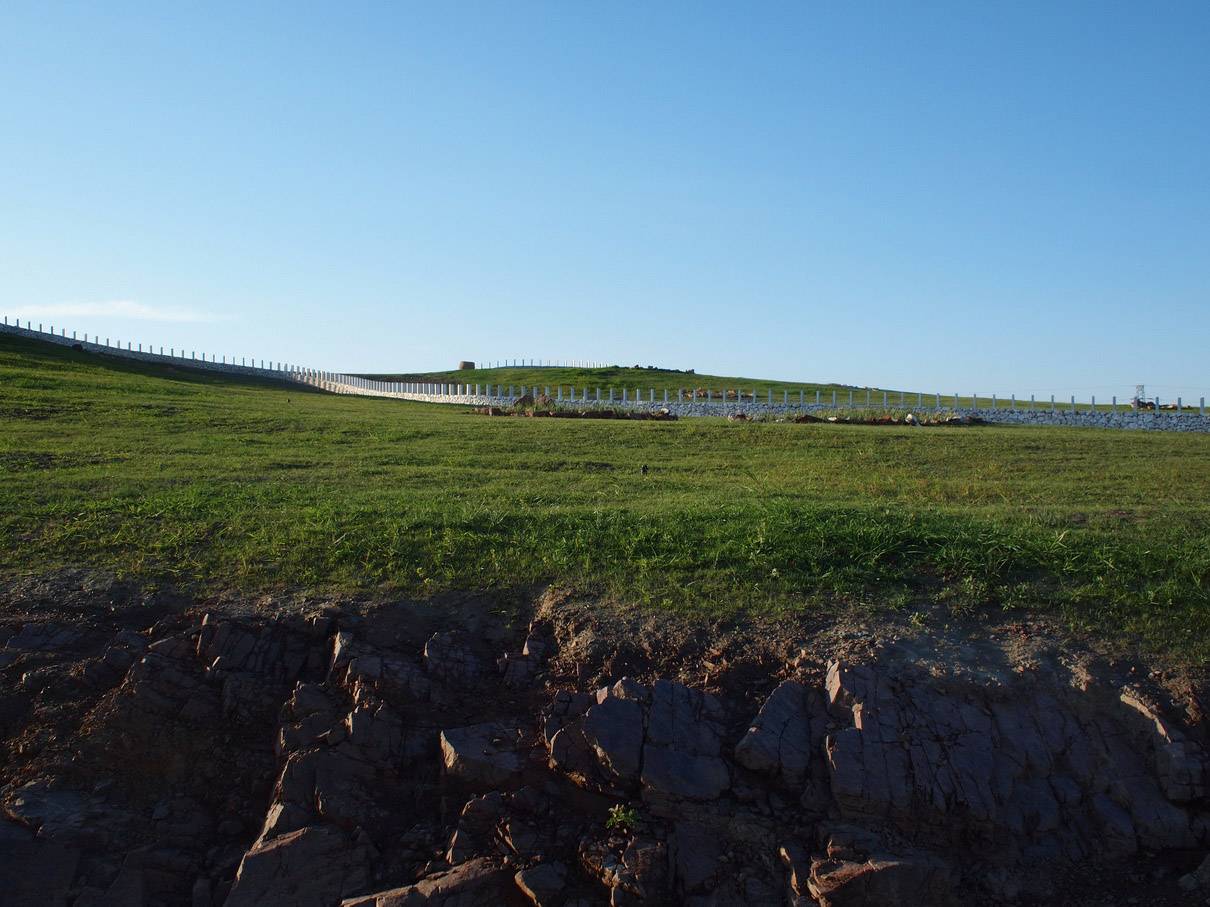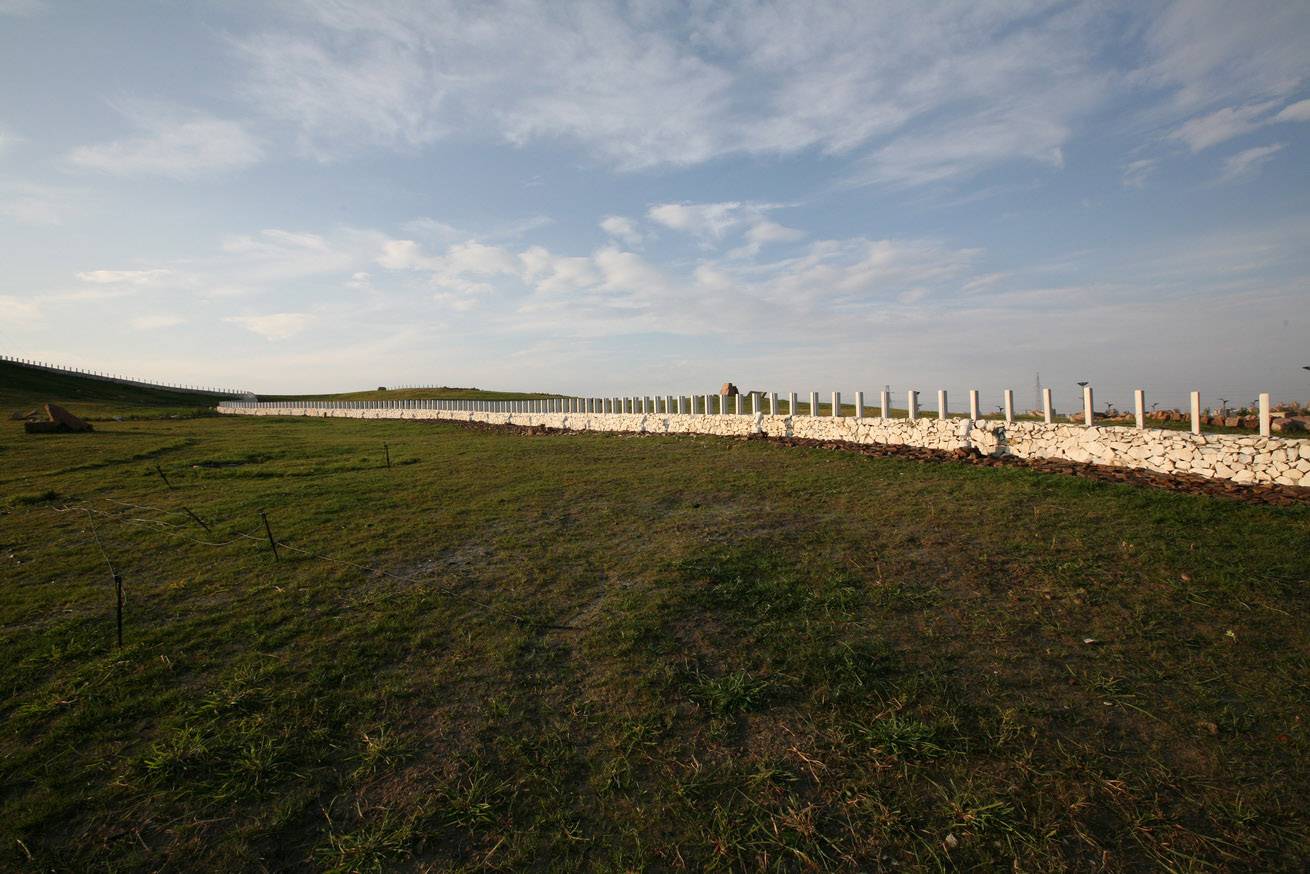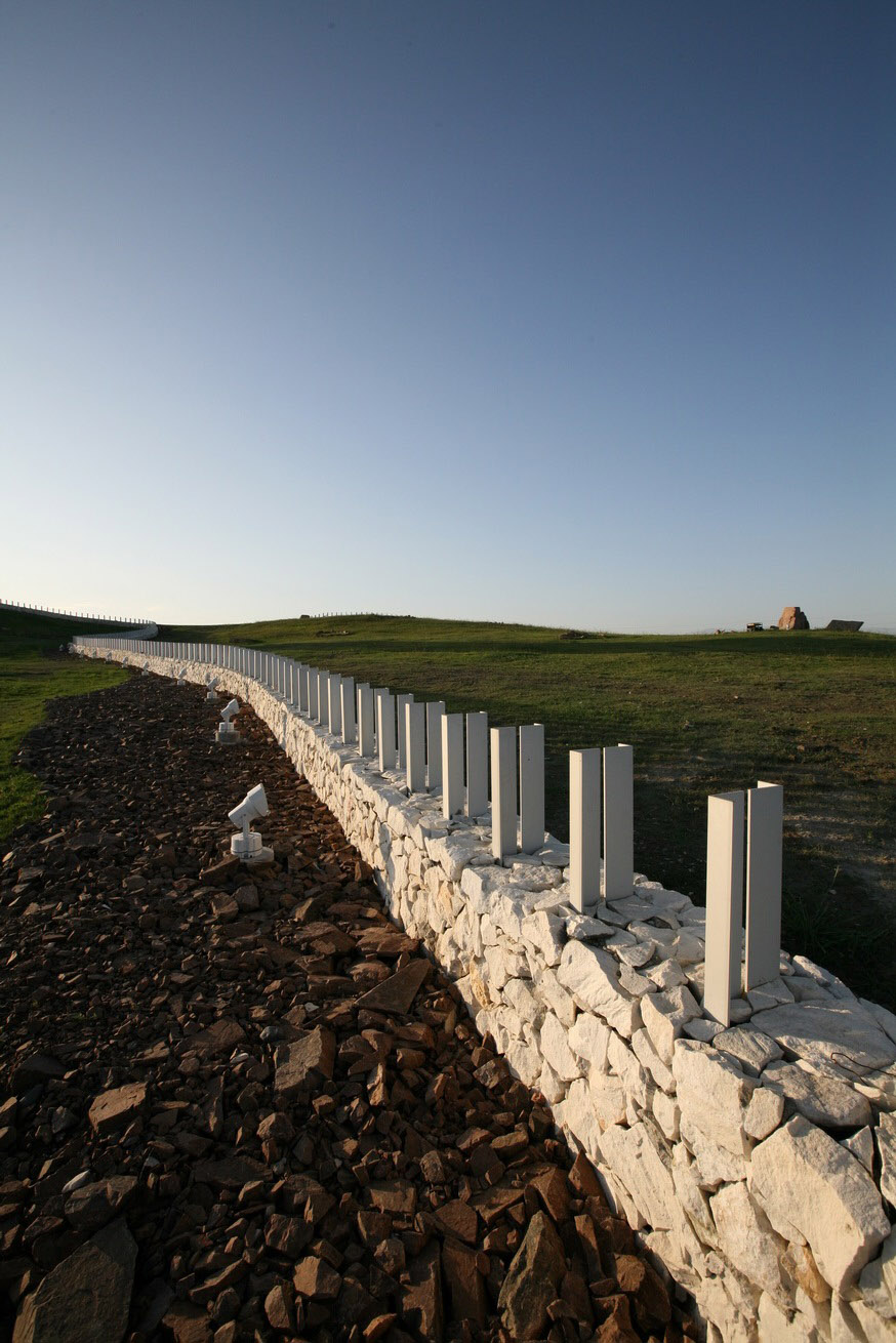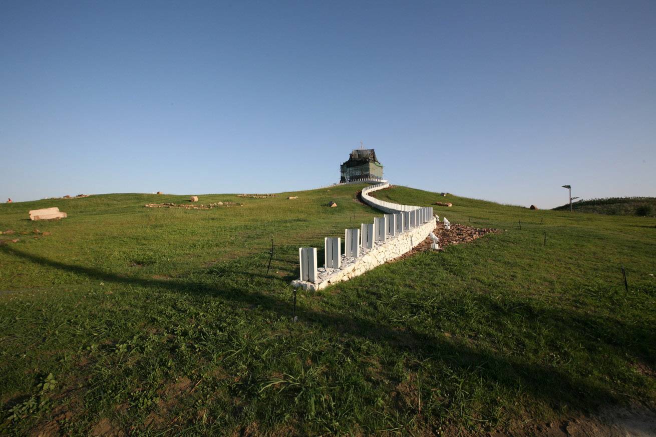 最后,在山體的東西兩側(cè)與最高峰的半山腰局部炸開山體,更好的挖掘和展現(xiàn)出石山的無限魅力。北側(cè)自然山體石壁間的旱生植被,裝飾了稍顯單調(diào)生硬的石壁,彰顯生命力的強(qiáng)勝;點綴在滿山的狼尾草、針芧、馬蘭等旱生地被,追溯了本地區(qū)特有的大自然情懷;遍布山體的散置石塊,實現(xiàn)了世上一切萬物的圓滿回歸;兩條金屬帶下方向的石墻延承了牧民日常生活畫卷;隨墻延伸的寬窄不一的外露山體,表達(dá)了人類留給賴以生存大地上的足跡;最高點的孤植密葉楊,再現(xiàn)了地區(qū)固有的美好景象。我們在創(chuàng)作初期就將此場所確定為:時間與秩序的解讀之場,并將空間營造的程度降至最低。唯一的操作——碎石疊墻也是希望更好的突出現(xiàn)狀到起伏山體形態(tài)。期待這里能成為城市居民的家園之感!設(shè)計中避免一切不必要的裝飾,追求隨時間變化表現(xiàn)出不同的表情,并形成場所特有的一種空間氛圍。和常規(guī)設(shè)計不同之處在于我們在這個場地上沒有刻意地去創(chuàng)造和表現(xiàn)設(shè)計師自己的意愿,只力求耐心地去培育這個場所。并通過細(xì)微的、甚至幾乎感覺不到細(xì)節(jié)的處理,確保空間形體,體量之間的關(guān)系不變。也就是說:表情、氛圍隨時間變化而不斷變化,但空間形體,體量關(guān)系卻始終爭取不變或者控制在最小程度的變。太空鋁板連接成的“哈達(dá)”、石塊干壘的“羊圍”、星星點點的旱生地被、常見但又不常規(guī)的“密葉楊”、自然裸露的山體石壁等無不期待更充分地表達(dá)—-場地的“時”與“序”。