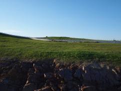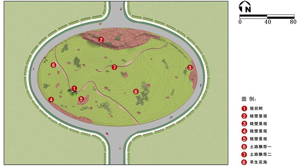 文化路環(huán)島呈橄欖形橢圓狀,東西長230m,南北寬140m的石頭山,最高點距四周道路的高差為13m,并呈較為自然的起伏地形,平面面積為3.26ha。項目要求環(huán)島不允許進(jìn)入只提供觀賞,與常規(guī)的設(shè)計不同的是免去了利用空間所要求的一切功能,是久違且難得的“純”設(shè)計項目。興奮過后卻又不知從何下手,因為從入校開始就從未做過這種不受任何利用條件限制的設(shè)計。首先,主要車流是南北向的文化路,作為文化路的終點,從北側(cè)過往的車輛上看環(huán)島成為最先映入眼簾的主景。為此在環(huán)島的北側(cè)大膽采用炸開山體,形成長近120米,稍向內(nèi)側(cè)凹陷狀的自然石壁,最高點只有4m的石壁卻以狹長的橫向體感,完成文化路視點焦點空間表現(xiàn)。