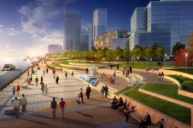 開放的階梯式生態(tài)景觀綠核連接濱江商貿(mào),將線性的濱水帶與商業(yè)辦公區(qū)建立直接聯(lián)系,使人群更好的走向?yàn)I江,并設(shè)計(jì)了一系列為辦公建筑與人群直接服務(wù)的半私密景觀空間。多元化的項(xiàng)目設(shè)置,完善了場(chǎng)地內(nèi)的活動(dòng)功能,為商務(wù)人群及濱江休閑人群提供“宜業(yè)宜樂”的活動(dòng)場(chǎng)所。