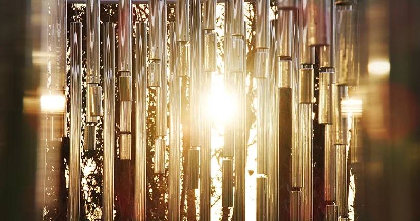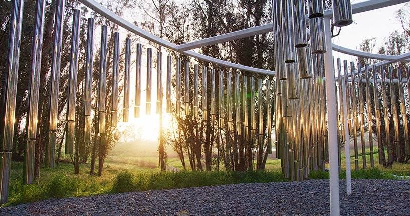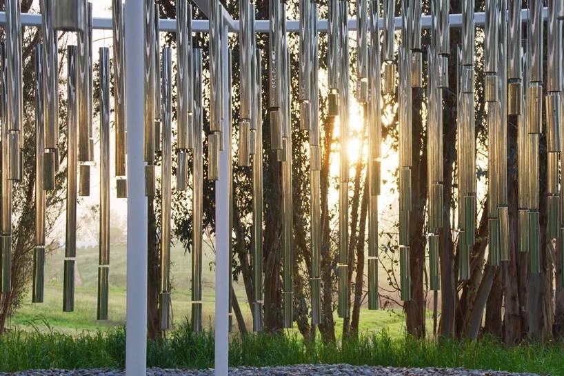 美國加利福尼亞州索諾瑪DONUM葡萄酒莊園中的尤加利樹林內(nèi)收藏著藝術(shù)家doug aitken藝術(shù)作品,一個充滿紀念性的聲景裝置——《聲丘》(sonic mountain)。裝置如同一個巨型風(fēng)鈴,當(dāng)風(fēng)掠過便會產(chǎn)生一個獨特的聲音,仿佛通過聲音能看到風(fēng)在林間起舞。doug aitken表示他想創(chuàng)造一個由自然演繹的,具有生命力的藝術(shù)品。