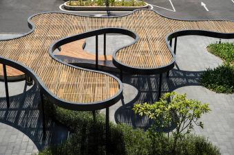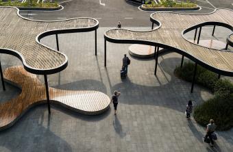 由竹子和金屬構(gòu)成的遮陽結(jié)構(gòu)與花池相結(jié)合,陰影與座位并不完全重合,使一部分長椅總是暴露在陽光下。這種形式會帶來一種持續(xù)的“錯位感”,它能夠讓使用者去主動尋找合適的位置,并且從這種“游戲性”中與場所建立互動關(guān)系。