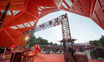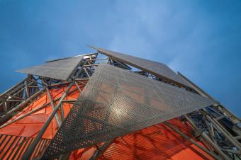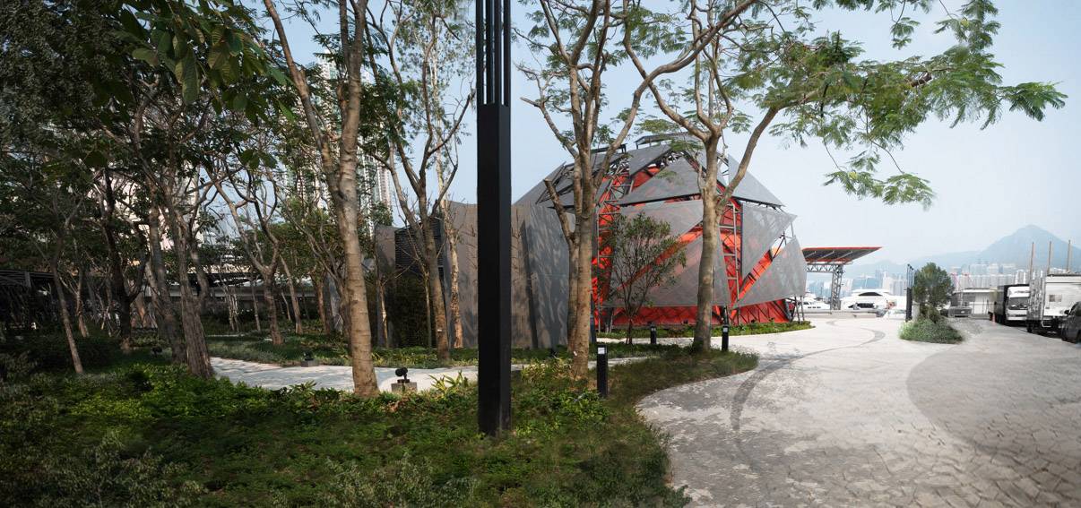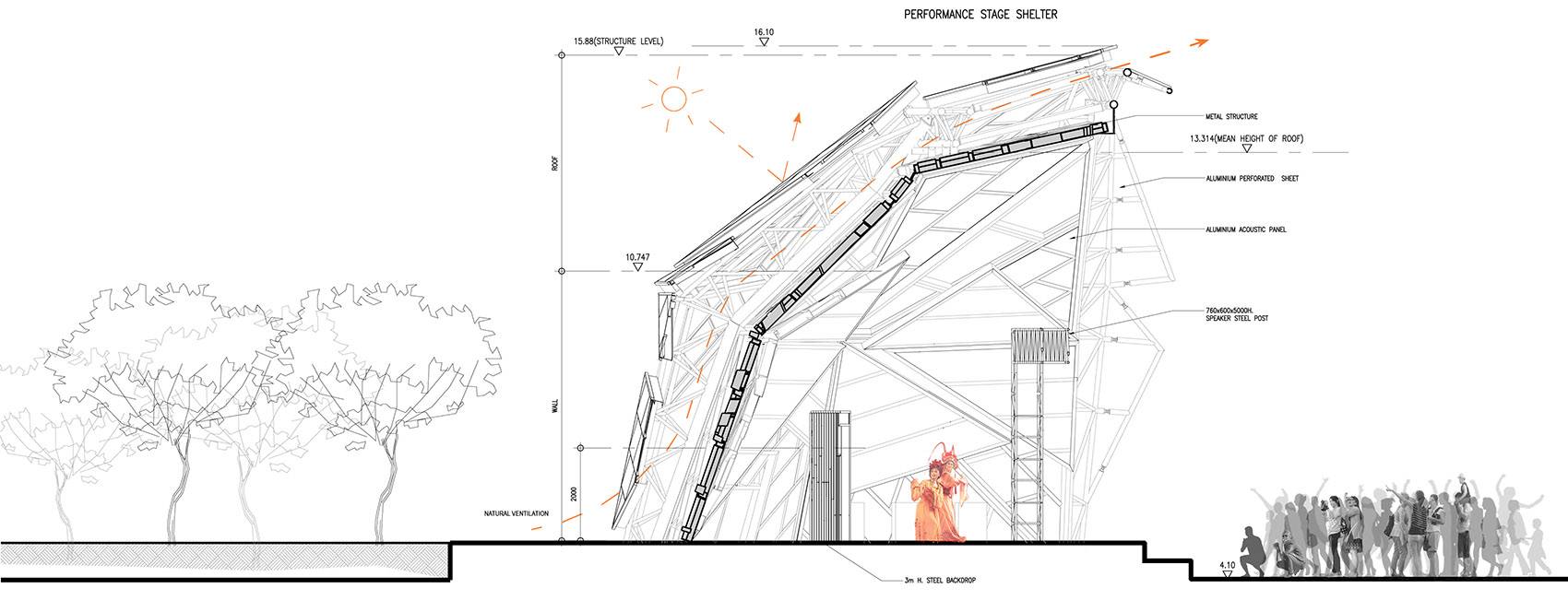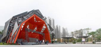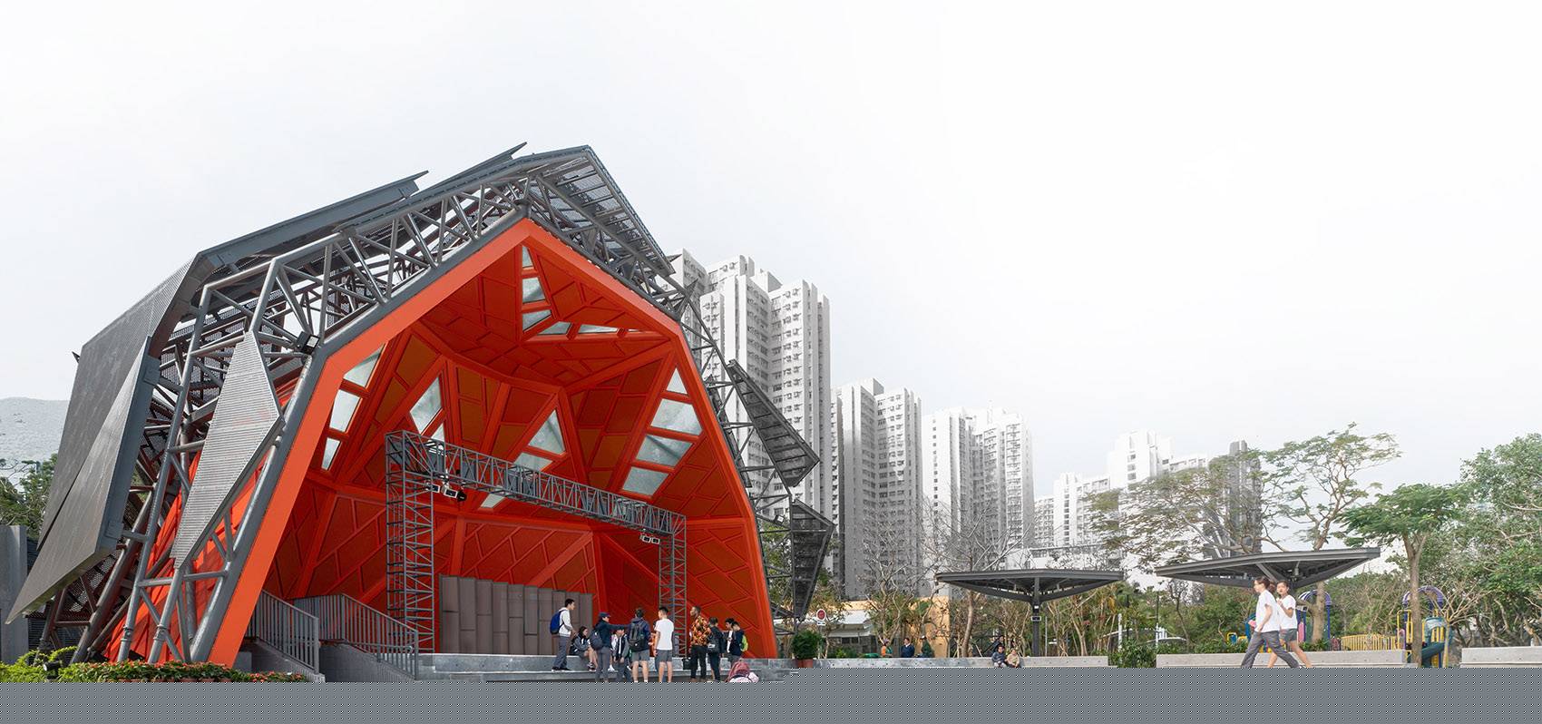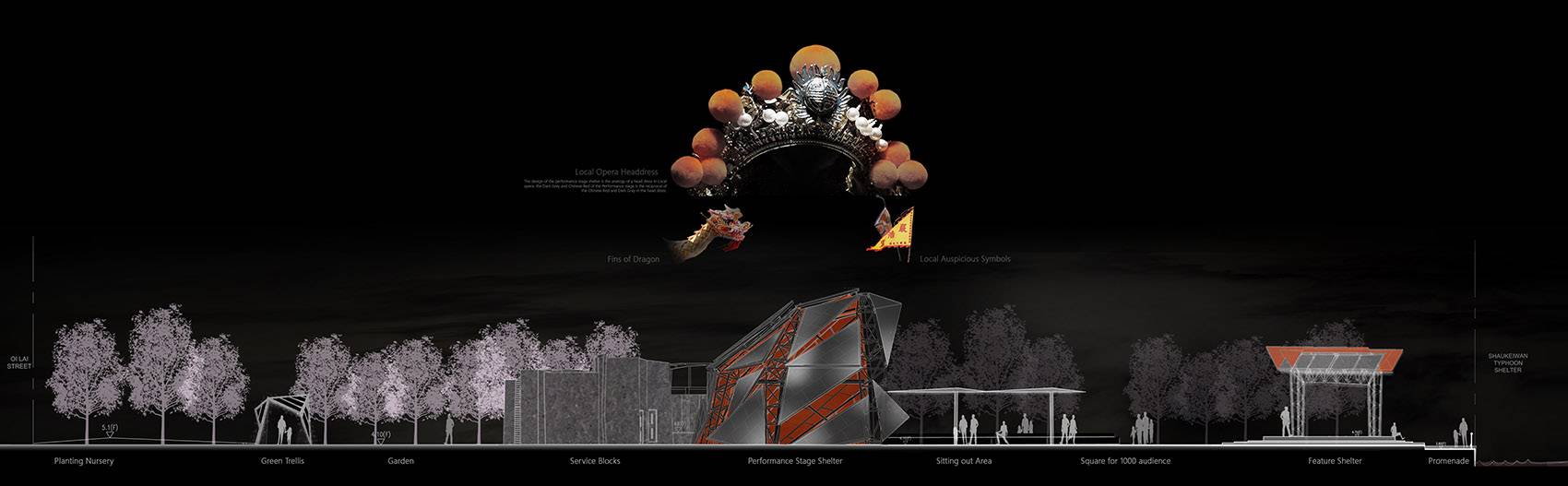 主舞臺(tái)的設(shè)計(jì)以模仿粵劇傳統(tǒng)頭飾為主要概念,花旦的頭飾乃是傳統(tǒng)戲劇的象征,反映出當(dāng)?shù)厝藢鹘y(tǒng)文化的依戀。舞臺(tái)以當(dāng)代材料制作的寓意吉祥的龍鰭為外層元素,主色調(diào)采用象征如意的朱砂紅和頭飾的青磚灰,突顯本地特色元素。傳統(tǒng)文化的繼承與延續(xù)反映了本地文化的活力,更與廣場的活動(dòng)相得益彰。