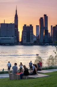 ▼市民們?cè)谒呅蕾p黃昏時(shí)曼哈頓的天際線