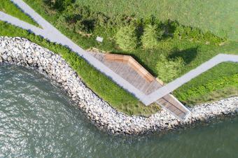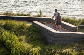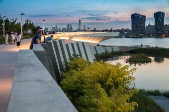 連接了公園各個(gè)主要功能區(qū)的道路向四面八方延伸,最終交匯至一條架空的步道處,使游客們可以遍覽曼哈頓的天際線和東河的景色。景觀瞭望臺(tái)被架空至距離水面22英尺處,從陸地邊緣開(kāi)始向外懸挑延伸55英尺。瞭望臺(tái)的木板橋和休息空間由一個(gè)鋼結(jié)構(gòu)支撐。這個(gè)鋼結(jié)構(gòu)還在階梯式露臺(tái)上創(chuàng)造了遮陽(yáng)空間,同時(shí)構(gòu)建起一個(gè)通往水邊的濕地漫步之旅。公園里的景觀瞭望臺(tái)既溫馨又超凡脫俗,它將整座城市延伸到了一座懸吊在新濕地水體邊緣之上的“懸崖”之上。