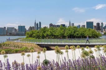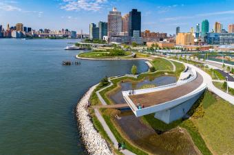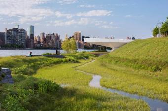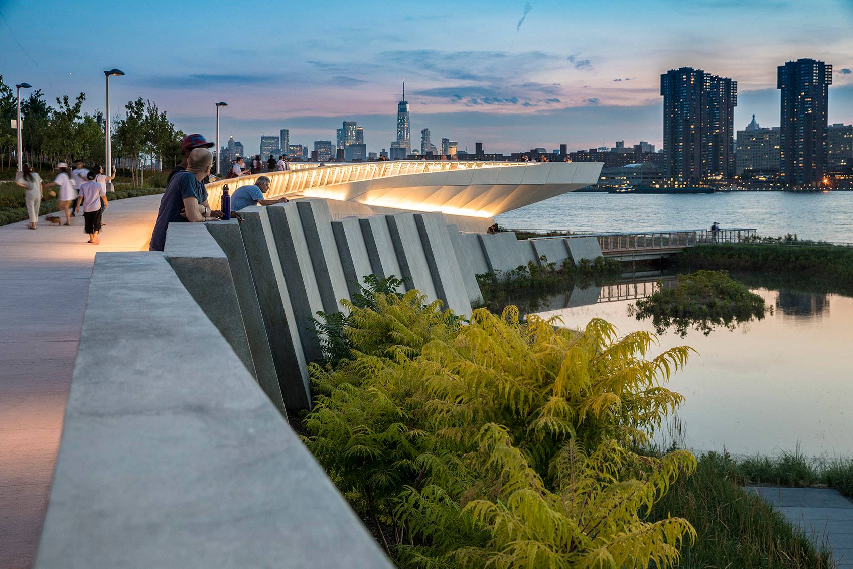 這座公園采用了一種不同尋常的方式來(lái)保護(hù)水體免受洪水的影響,同時(shí)為幫助水濱區(qū)域環(huán)境的恢復(fù)提供了一種新模式。景觀設(shè)計(jì)師在河流的上方建造了一條連續(xù)蜿蜒的步道,不僅可以讓市民在水邊散步,享受愜意的時(shí)光,還有效地保護(hù)了將近1.5英畝的新建濕地。此外,設(shè)計(jì)還充分利用了場(chǎng)地本身的地形特點(diǎn),創(chuàng)造了許多吸引人的空間景象:樹(shù)木在隆起的草地上投下陰影,人行小橋通向一座新的小島,游客們駕駛著皮艇在水面上暢游,運(yùn)動(dòng)和野餐露臺(tái)上有人正在享受生活,步道外一系列私密的休息放松空間保護(hù)了使用者的“小秘密”,一個(gè)引人注目的懸臂瞭望臺(tái)“盤(pán)旋”在濕地上空,觀景的人們?cè)谶@里俯瞰曼哈頓迷人的天際線全景。