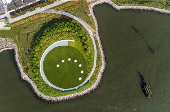 本設(shè)計(jì)重組了基地原有的半島空間,使其給人一種置身于小島上的錯(cuò)覺(jué)。游客們沿著一條環(huán)繞著整個(gè)河岸線的連綿步道行走,通過(guò)一座步行橋到達(dá)重組的“小島”上。紐約藝術(shù)家Nobuho Nagasawa專(zhuān)門(mén)為這里創(chuàng)造了一個(gè)名為L(zhǎng)uminescence的藝術(shù)裝置,人們可以通過(guò)這個(gè)直徑6英尺的混凝土圓盤(pán)來(lái)觀賞到月相的變化。該裝置由混凝土和磷光聚合物制成,鑿刻在表面上的坑坑洼洼處反映了月球上的隕石坑、山川和溪谷。值得一提的是,該雕塑裝置獲得了由紐約市公共設(shè)計(jì)委員會(huì)頒發(fā)的卓越設(shè)計(jì)獎(jiǎng)。