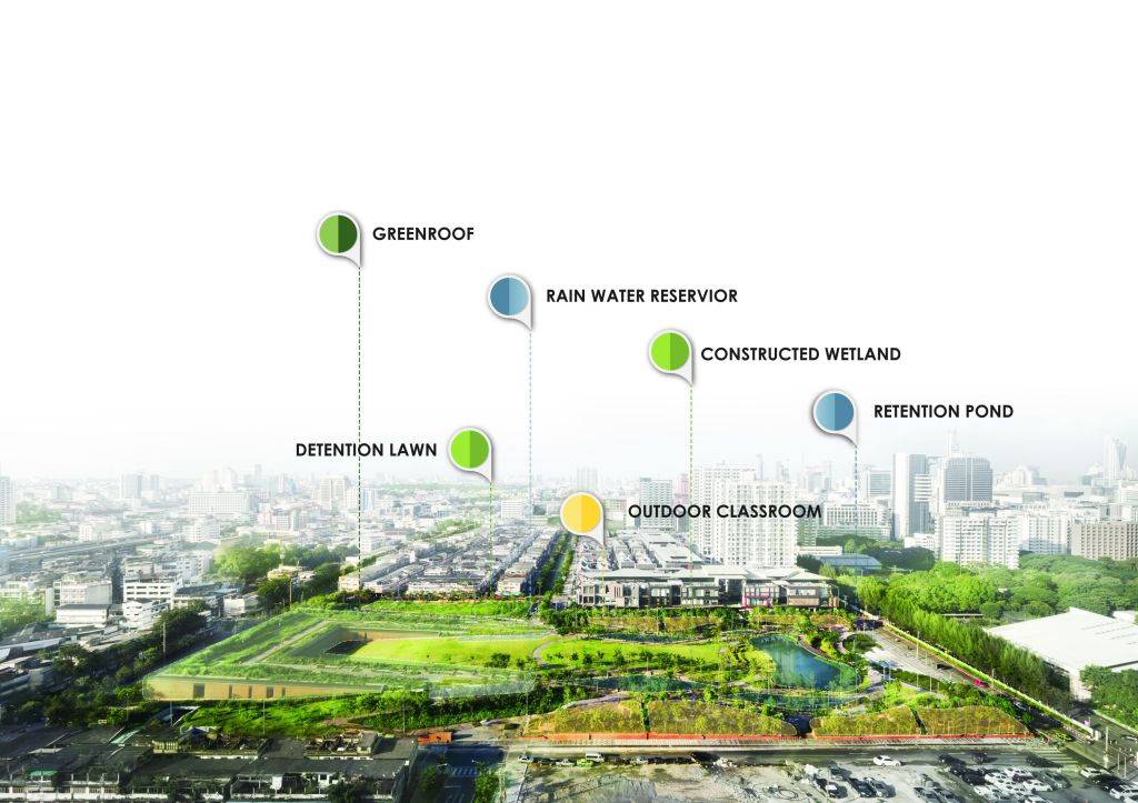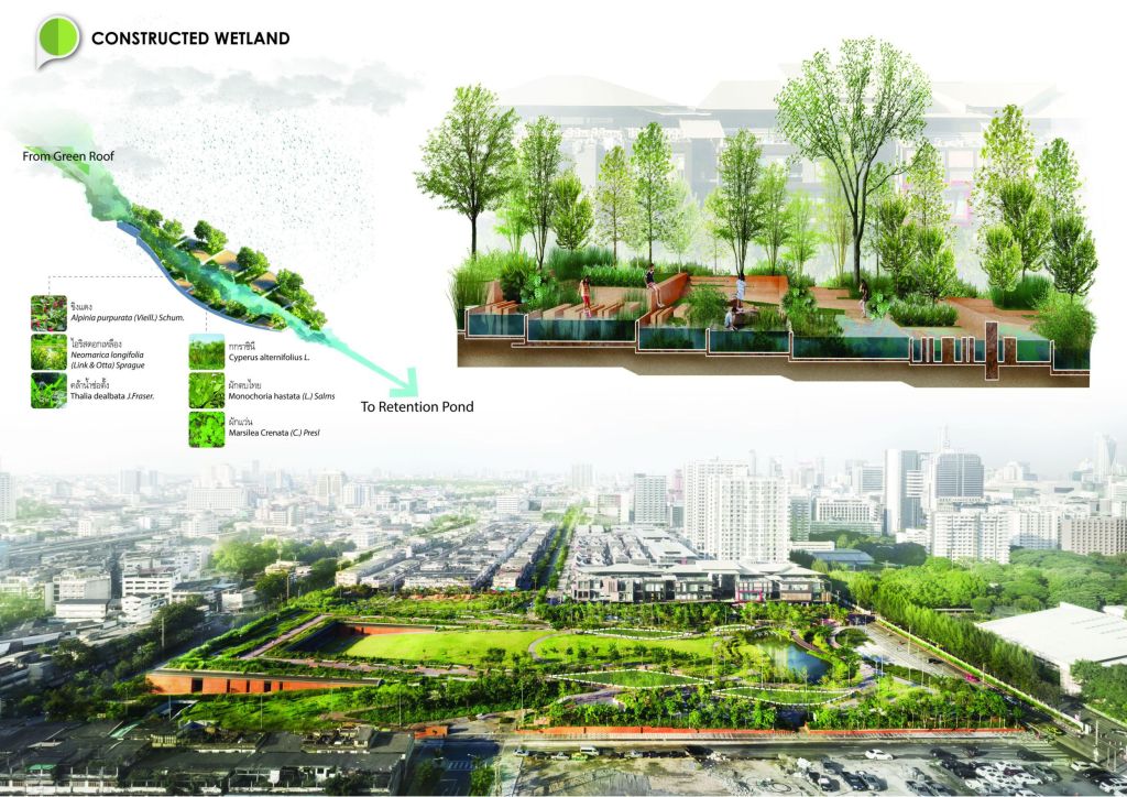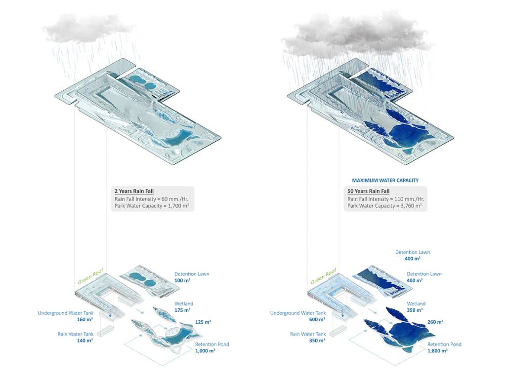 而猴子的臉頰,則是泰國(guó)已故的國(guó)王Bhumibol(1946年-2016年在位)經(jīng)常用來描述曼谷如何應(yīng)對(duì)洪水的比喻。他說,猴子將食物藏在臉頰中,在需要進(jìn)食時(shí)再吃下去,曼谷也應(yīng)該儲(chǔ)藏過多的雨水,在城市需要的時(shí)候加以利用。這一概念給Voraakhom帶來了啟示,決定在公園內(nèi)建造儲(chǔ)水系統(tǒng),包括屋頂綠化濕地,滯留草坪和蓄水池。