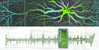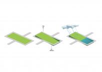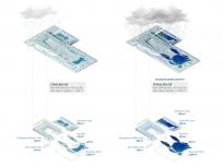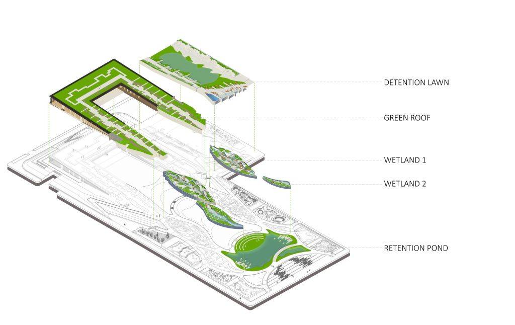 雨水從綠色屋頂流向濕地,這兩種構(gòu)成公園兩側(cè)的主體,之后流入蓄水池,另外草坪也可以收集一部分雨水。