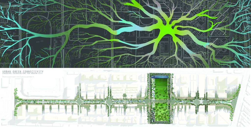 上圖: CU公園的步行街從公園的兩邊延伸出來,融入相鄰的城市街區(qū)。下圖: 這些路徑受到雨樹根部系統(tǒng)的啟發(fā)。