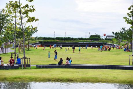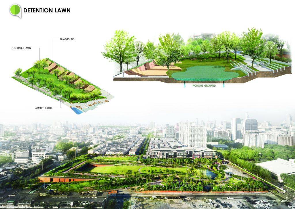 而在嚴(yán)重的洪水情況下,蓄水池能與公園中央草坪共同收集水,使蓄水區(qū)面積擴(kuò)大近一倍。公園的設(shè)計(jì)水容量高達(dá)100萬加侖?!霸谛钏睾筒萜旱膸椭?,如果城市被洪水淹沒,我們可以隨時(shí)控制洪水,”Voraakhom說?!暗鹊疆?dāng)城市里洪水被排干之后,我們可以把公園中儲(chǔ)藏的水排入公共污水系統(tǒng)?!?/p>
