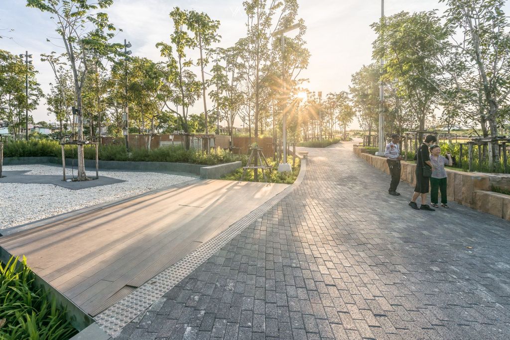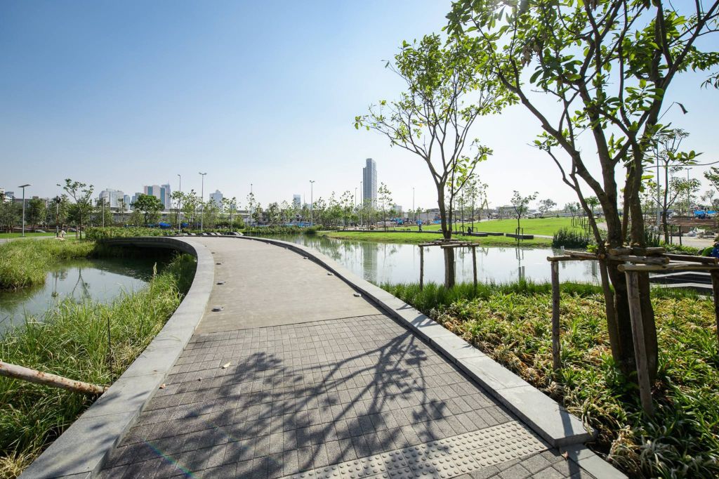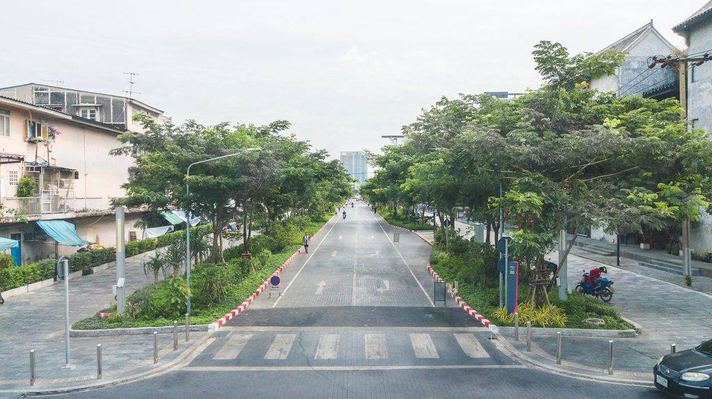 為了模仿雨樹延展的枝干和吸水根,Voraakhom在與公園垂直的交通繁忙的道路上添加了綠色廊道。盡管道路從12米擴(kuò)大到30米,但實(shí)際上汽車車道反而減少了,它們被自行車道和人行道取代,這或許是曼谷第一次將主要道路改造為人行道。如今,行人和騎自行車的人聚集在公園兩側(cè)綠樹成蔭的林蔭道上。這些道路包括自行車道和寬闊的人行道,人們可以輕松地步行前往公園。