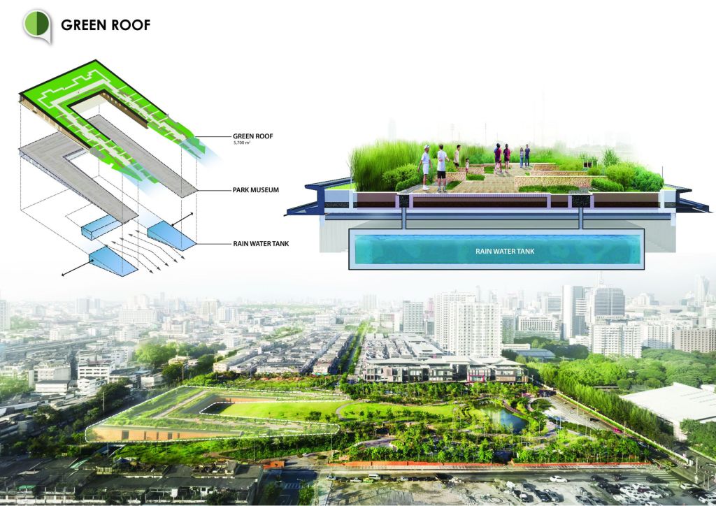 公園有泰國(guó)最大的綠色屋頂,位于公園西端的新建博物館擁有面積達(dá)5220平方米的屋頂綠化,植物材料均為當(dāng)?shù)卦参?,幾乎不需要維護(hù)。屋頂能夠吸收每年7-10月的大量雨水,也能經(jīng)受3-6月的炎熱高溫。