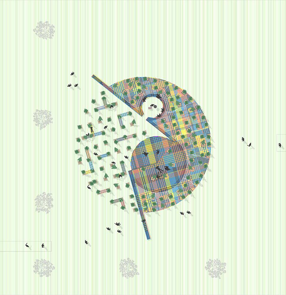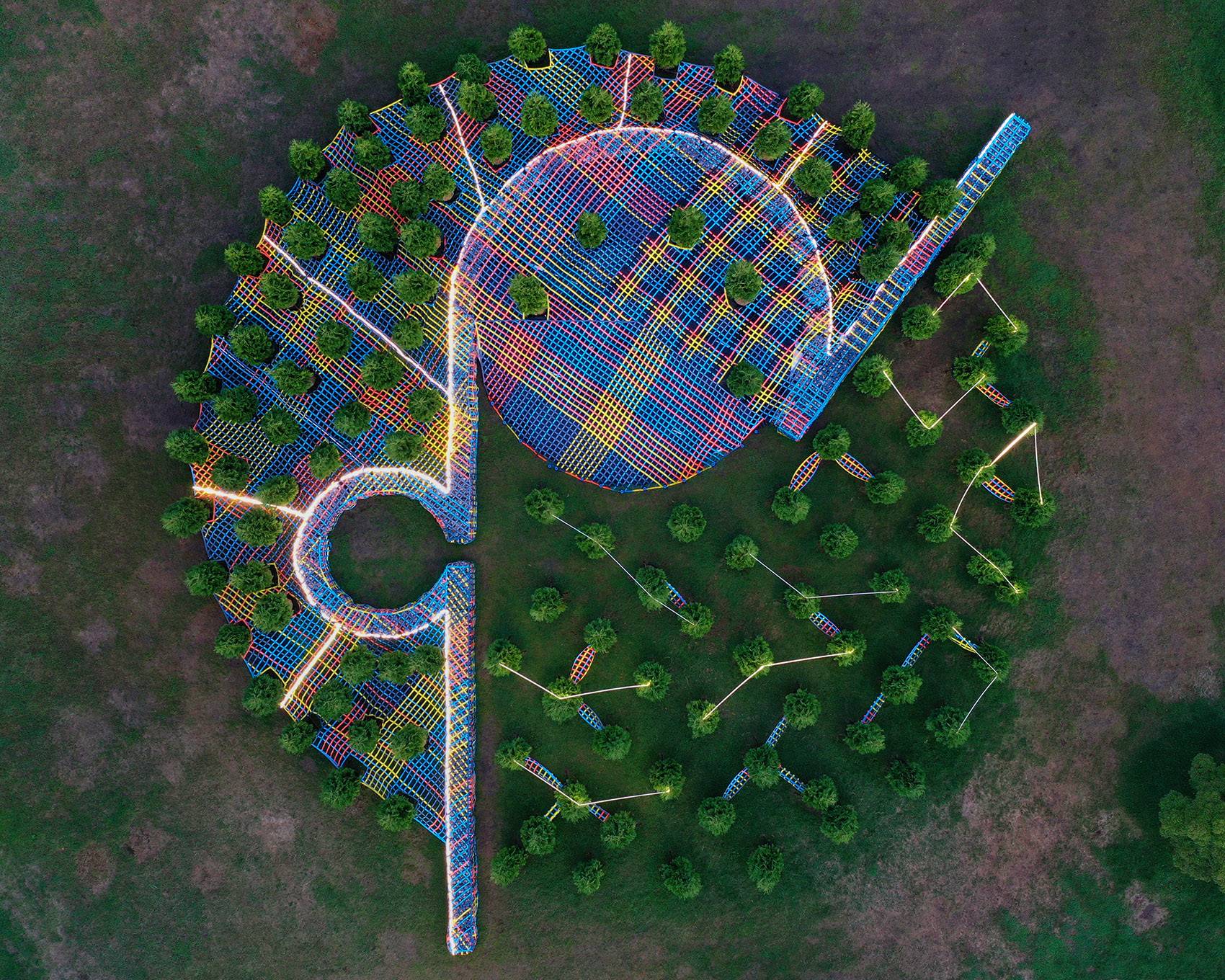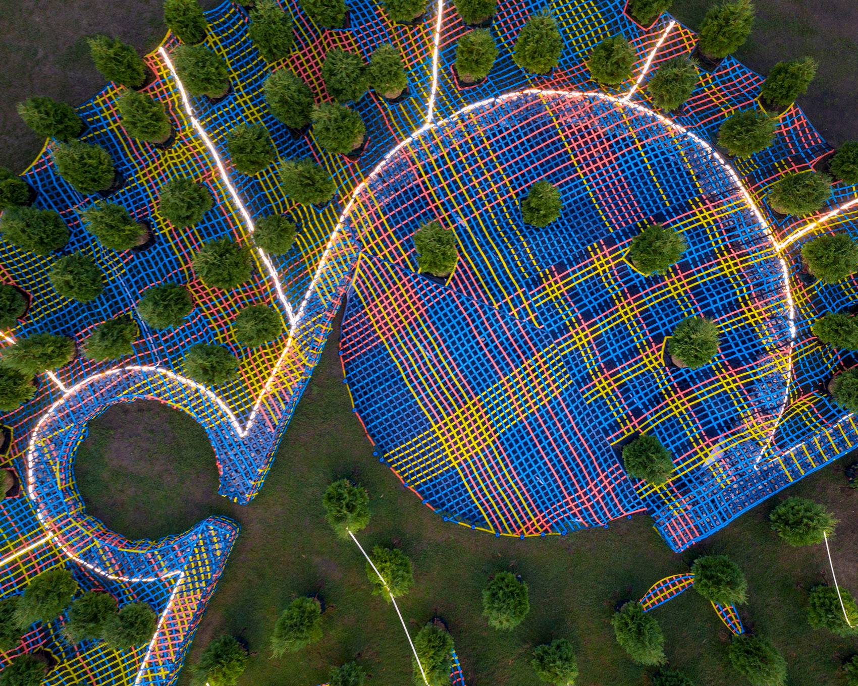 ▼裝置俯視圖,側(cè)柏結(jié)合著彩色繩帶,打造出一個大型的吊床結(jié)構(gòu)