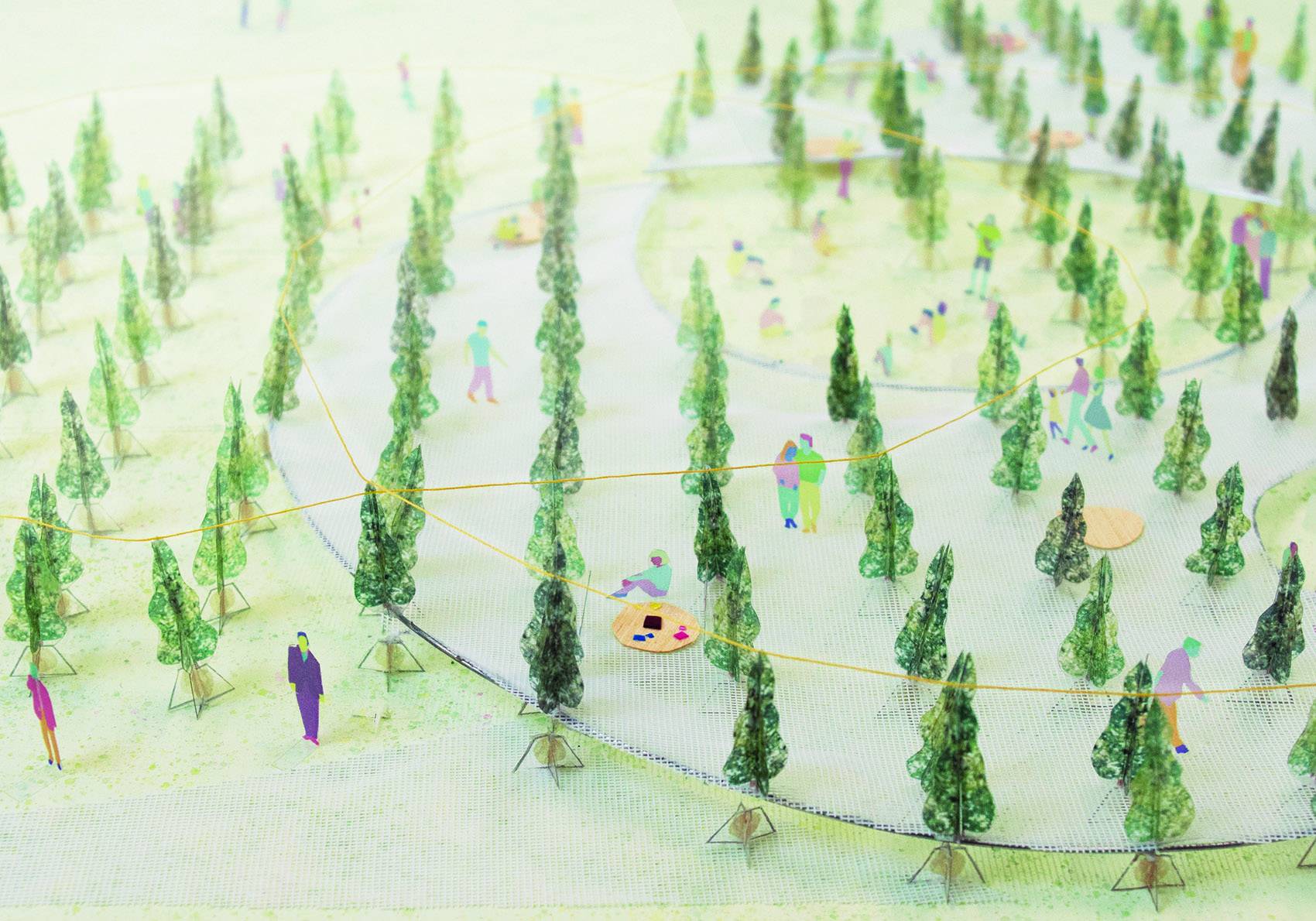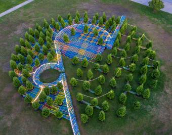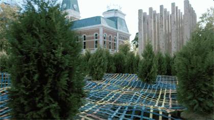 建筑事務所SO – IL與Miller House and Garden合作,購買了130棵活側(cè)柏,將它們放置在Bartholomew縣法院(Bartholomew County Courthouse)前的草坪上,結(jié)合著彩色繩帶,打造出一個大型的吊床結(jié)構(gòu)。展覽結(jié)束后,這些側(cè)柏將被永久地留在草坪上,從而將本裝置項目的原始建筑靈感與哥倫布市的Bartholomew縣——印第安達州七個國家歷史地標之一——的管理工作直接聯(lián)系在一起。