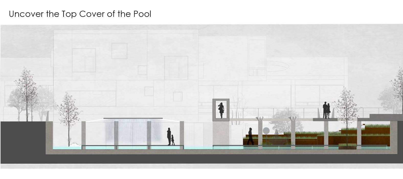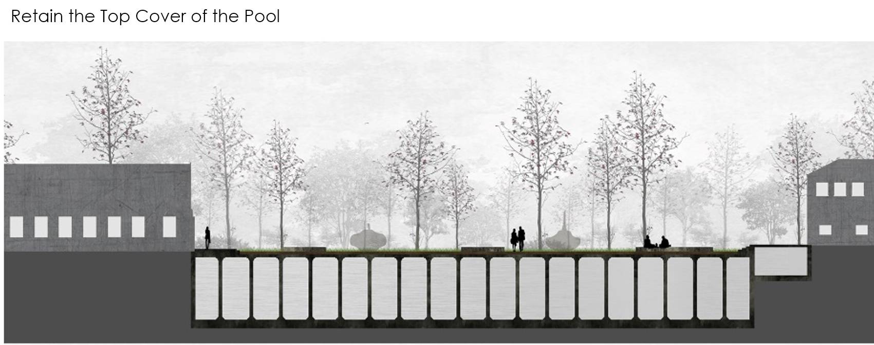 1.人工干預(yù):掀開頂蓋,展現(xiàn)水池地下結(jié)構(gòu)空間。設(shè)計師掀開池子的過程充滿了各種不確定性和驚喜。池底場地痕跡大部分保留下來,在此基礎(chǔ)上增加必要的景觀設(shè)施。