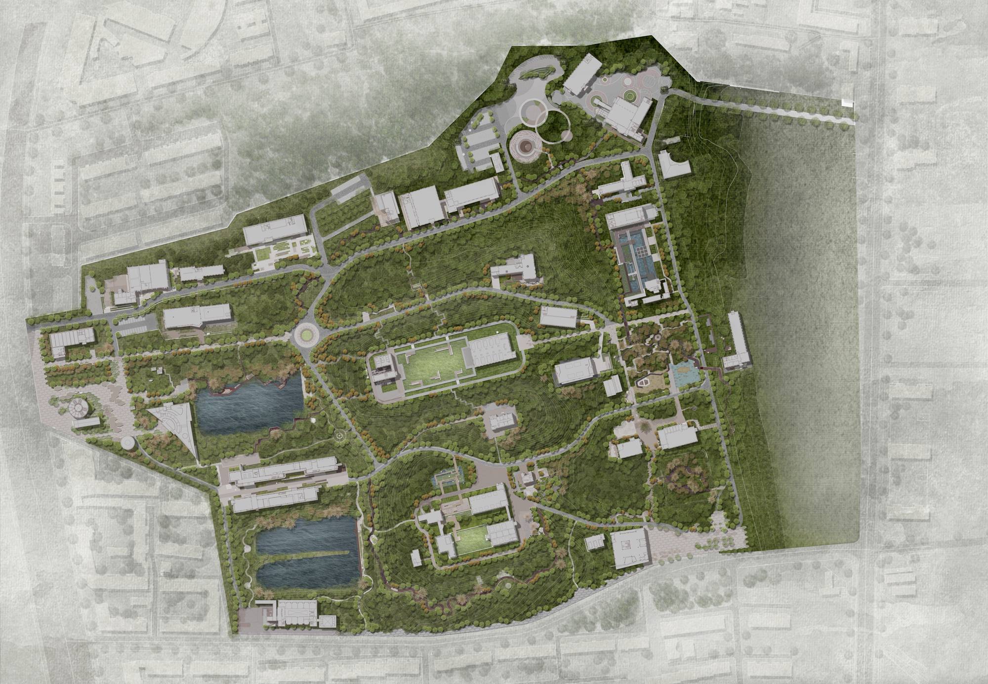 慢行系統(tǒng)將場地原有的沖溝、建筑、森林、露天水池及城市界面有機串聯(lián),并植入了豐富的社交場地,共同構(gòu)建園區(qū)游覽體系。