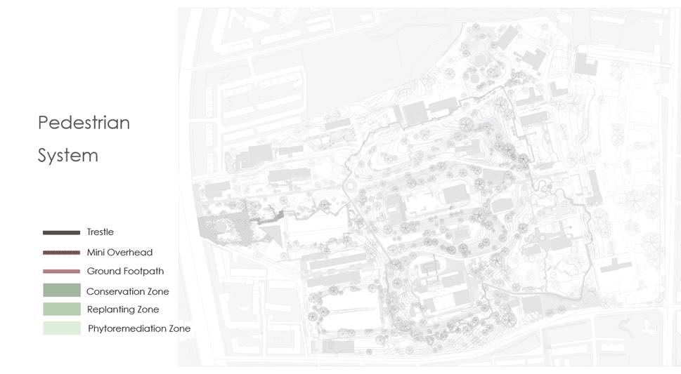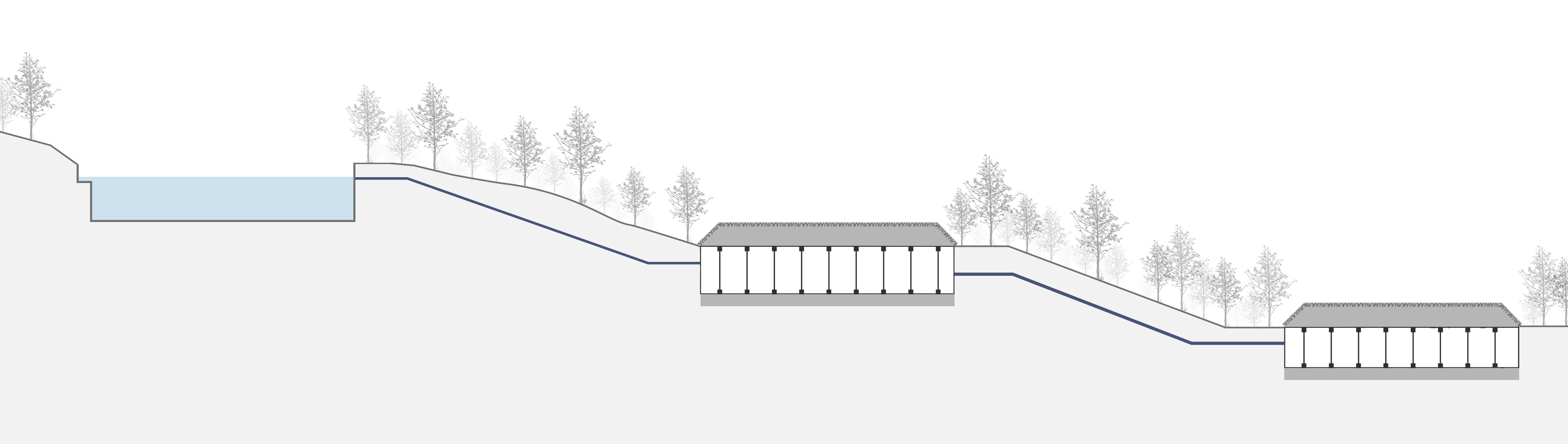 場地原有的池體管道除了凈化水源以外還是園區(qū)特有的雨洪凈化系統(tǒng),重新利用場地落差和池體,通過地表徑流、雨水花園及池體凈化系統(tǒng),使整個園區(qū)實現(xiàn)自凈化。