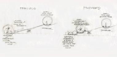 ▲改造后在軸線上眺望Drumheller噴泉。新的地形和交通流線主要為行人和自行車(chē)服務(wù),設(shè)施都隱藏起來(lái)了。