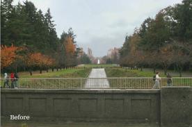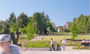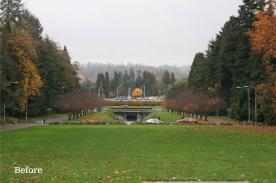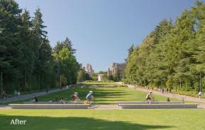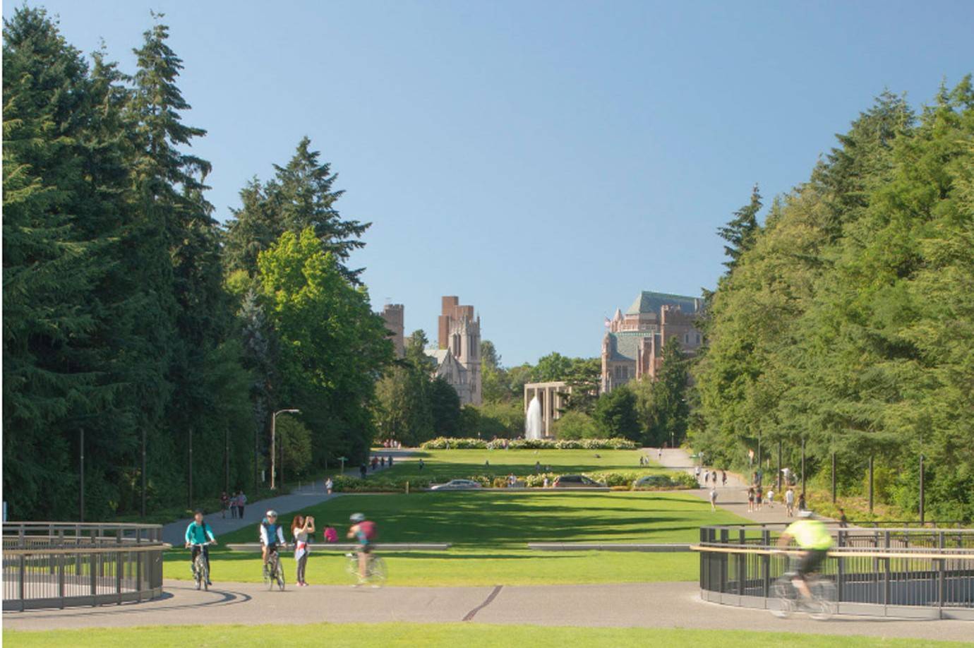 The newly planted lawns along the gently sloping Vista function as 'front porches' to the University: places for gathering, relaxation, and events, while connecting paths and small plazas link the Vista to its surroundings. The grading of the lawn and Vista creates the illusion of a foreshortened distance from outside of campus looking toward the fountain, making the fountain appear closer than it really is. The grading also uses careful placement of horizons to obscure Montlake Boulevard traffic from key views of Mt. Rainier. Between Stevens Way and the land bridge, the grading subtly forms a promontory and a bowl to create a variety of experiences and to encourage different activities within the axis.