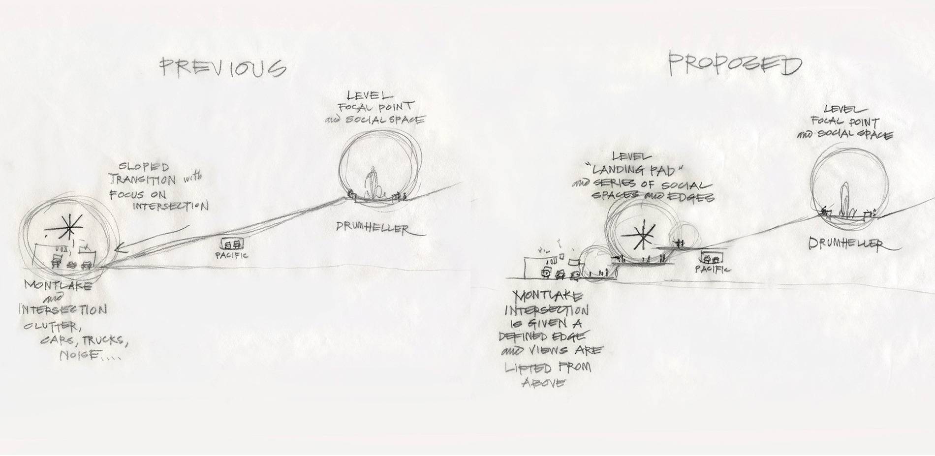 ▲改造前在軸線上眺望Drumheller噴泉。此時(shí)的地形與交通流線主要為汽車(chē)服務(wù),而不是行人。