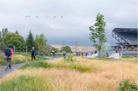 ▲從人行高架橋眺望新建輕軌車(chē)站和哈士奇體育場(chǎng),植被為下雷尼爾維斯塔營(yíng)造了歡迎的氛圍,并與標(biāo)志性的森林相連。