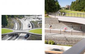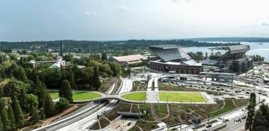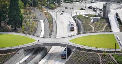 The University of Washington's Lower Rainier Vista Project extends and completes the Olmsted Brothers' historic vision for a monumental campus axis within the intersection of many transportation modes. The design references Collegiate Gothic forms and uses fine-tuned grading of the Vista to frame views, integrate modern infrastructure, and provide new ADA connections. A new land bridge facilitates multimodal integration of pedestrians, cyclists, buses, and automobiles between the new light rail station at Husky Stadium, the University of Washington Medical Center, and the University campus heart.