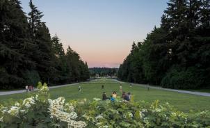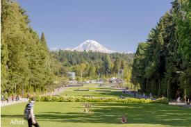 Native planting, carefully calibrated to work with the load restrictions posed by the existing below-grade parking garage, draws the Lower Rainier Vista into the broader campus character. It also extends to the natural connection presented by the view of Mount Rainier beyond. Heritage trees, significant in stature and carefully protected during construction, compose the axis' forest frame. New trees were interplanted for future succession. The south end of the Vista required plants that will thrive in direct sunlight, but also flourish in the future as the canopy of new trees develops.