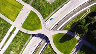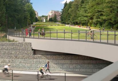 ▲俯瞰步行橋:橋?qū)⑤S線的兩端連接起來(lái),道路下沉,使校園與輕軌車(chē)站之間的步行道路無(wú)縫連接