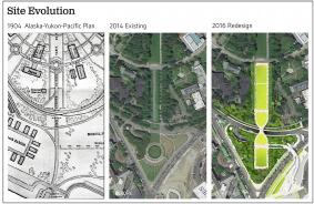 The Rainier Vista at the University of Washington in Seattle was originally designed as the spine of the 1904 Alaska-Yukon-Pacific Exposition fairgrounds. Linking the pre-existing campus oval plan to the inspiring view of Mount Rainier, the half-mile long Rainier Vista quickly became the iconic representation of this West Coast University's connection to its dramatic natural setting.