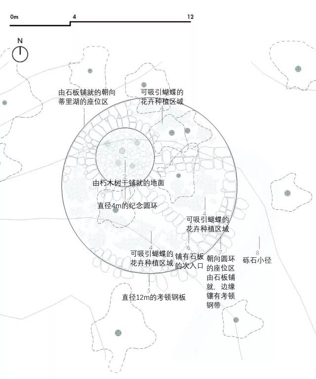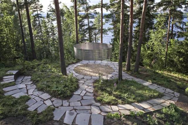 整個場地背山面水。由于場地北側(cè)土層較淺,不適于植物生長,剛好留出了眺望湖面的開闊視野。而其他三面環(huán)繞著參天的松樹和云杉,給人以溫柔環(huán)抱之感。