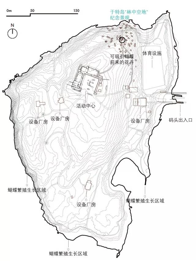 古今中外,人們常將蝴蝶比作死亡的使者或是逝去之人的化身,比如成年黃緣蛺蝶的翅膀與傳統(tǒng)喪服的樣式類似,因而被認為是悲傷和演變的象征。這一意象引發(fā)了場地設(shè)計的另一層巧思——用植物吸引島上的蝴蝶前來此地。
