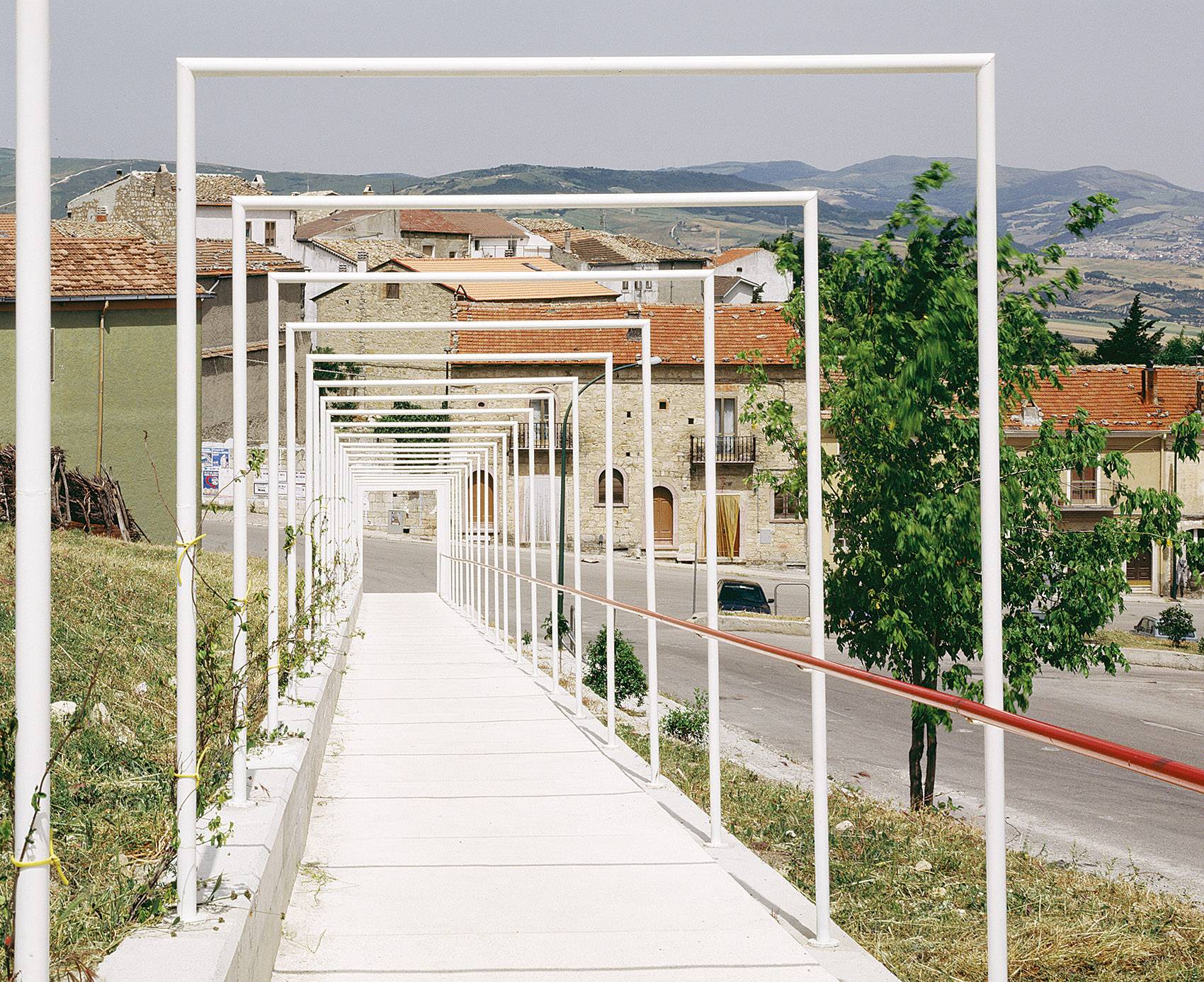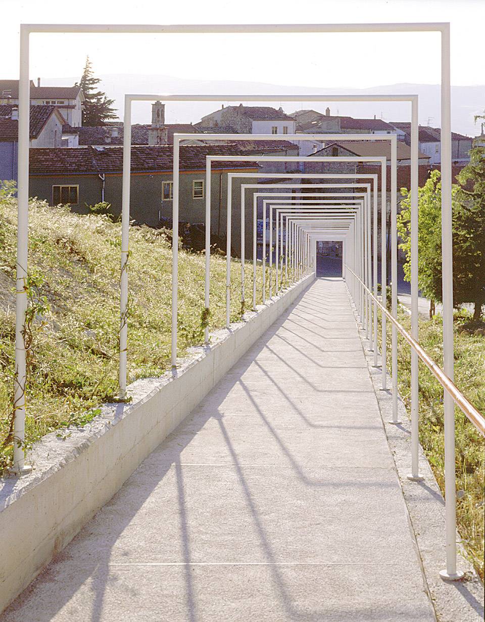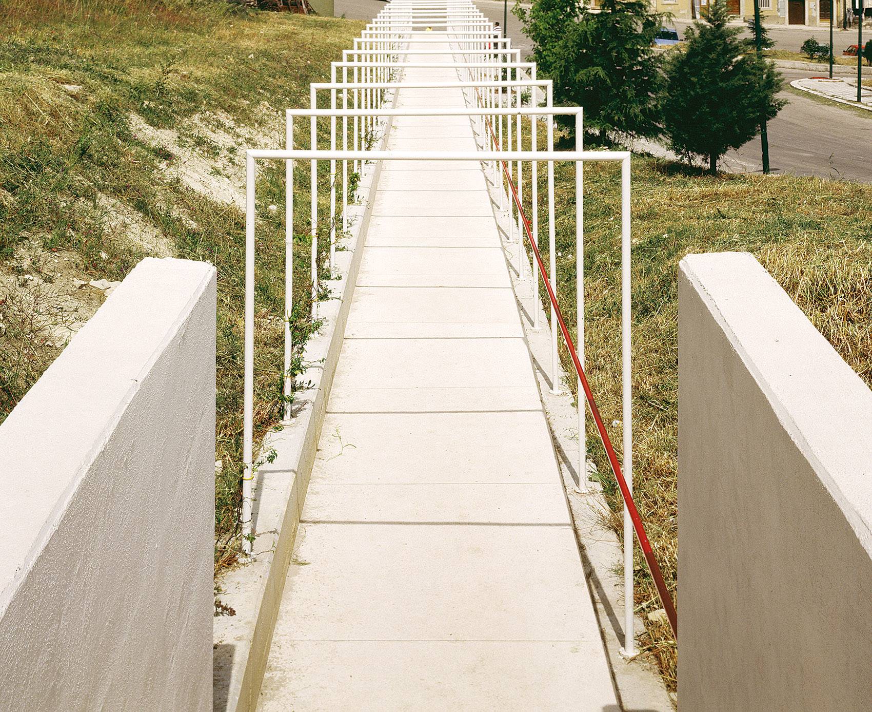 步道貫穿了一片傾斜的草地,將市中心的公共廣場與城市高處的建筑聯(lián)系了起來。與公共行政部門的預(yù)期相反,本步道具有極強的可識別性。它如同一個大型的雕塑,為原本平平無奇的草地帶去了獨一無二的特征。