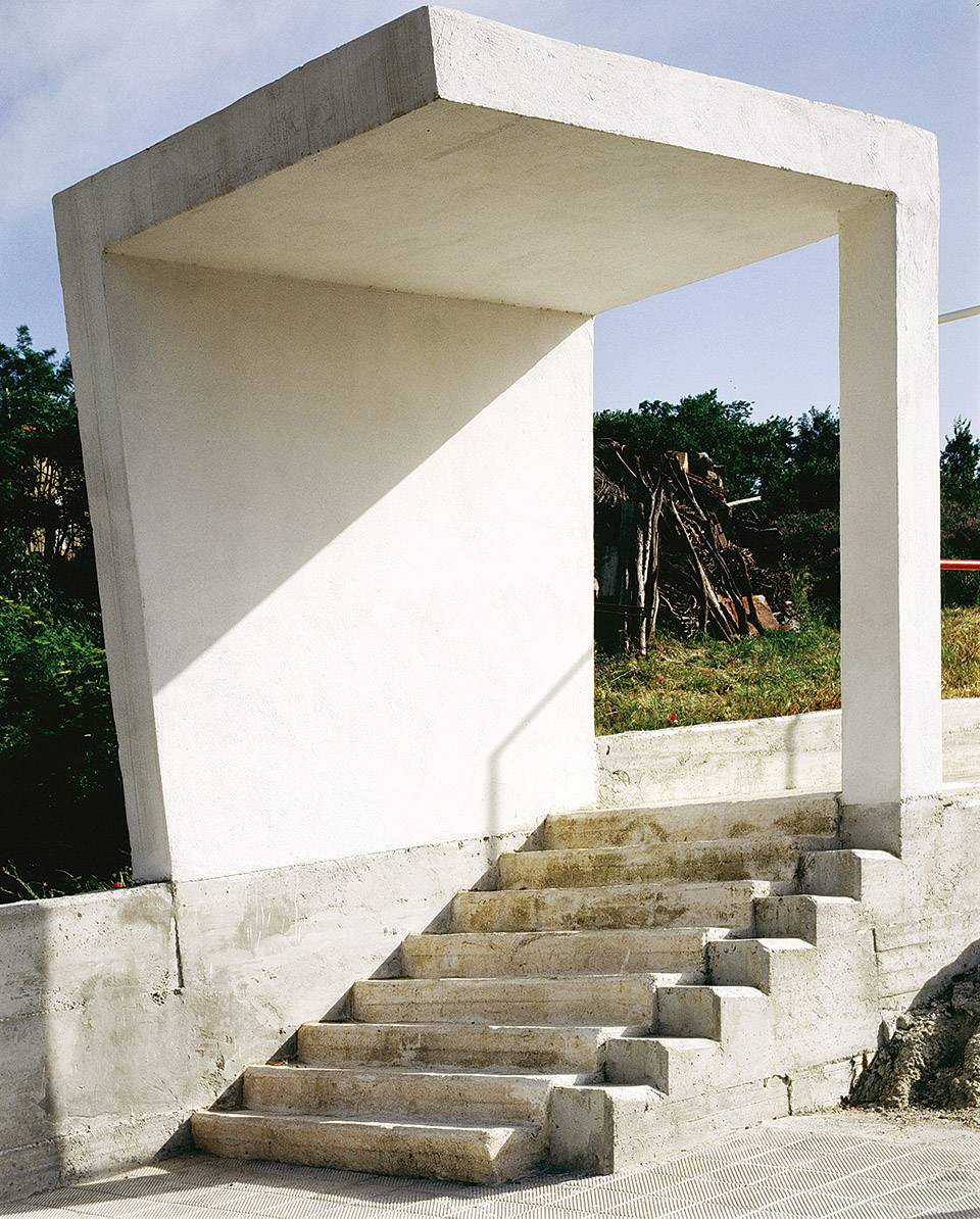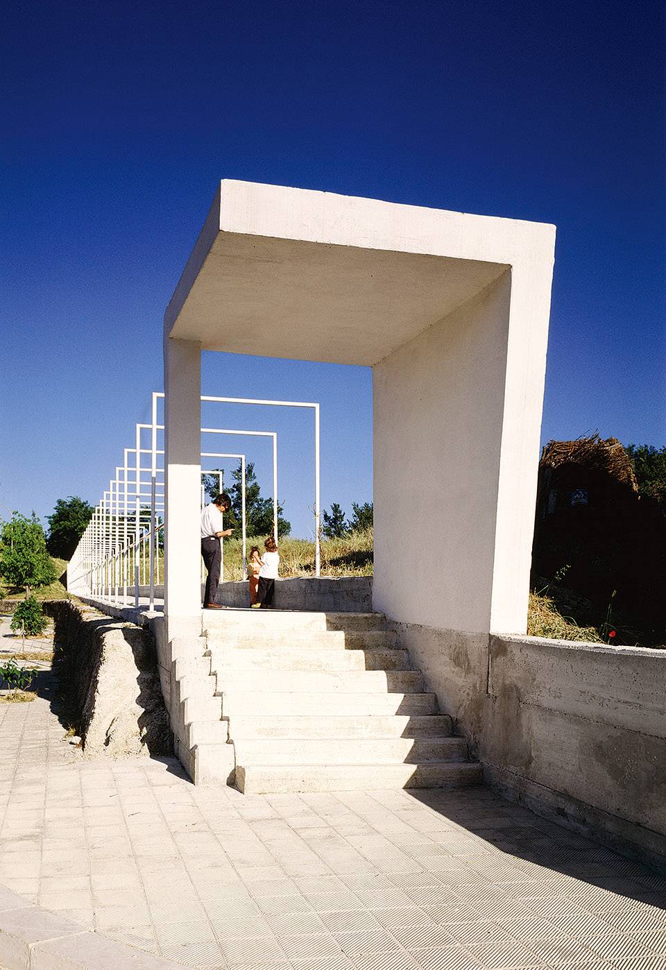 建筑師在地勢較低的一端設(shè)置了數(shù)個臺階和一個半圍合的有頂結(jié)構(gòu),將其作為步道的入口,并將地勢較高的一端作為步道的終點。