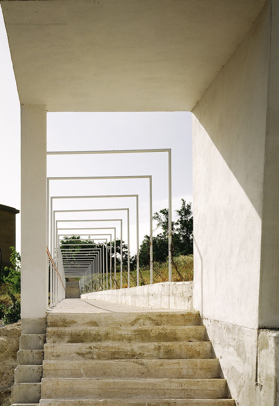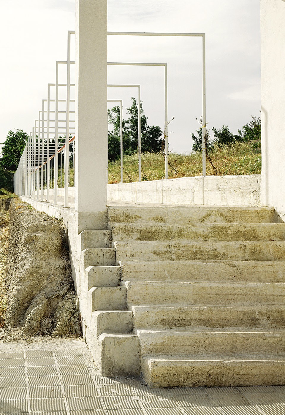 沿著步道方向等距排列的金屬框架作為人工元素,不僅具有很強的幾何性,更與周邊的自然環(huán)境形成了直觀的對比。本項目由鋼筋混凝土結(jié)構(gòu)、白色混凝土道路鋪面和白色的鐵質(zhì)框架構(gòu)成,建筑材料十分簡單。但即便如此,整個項目的總造價也高達(dá)5,000萬里拉。當(dāng)春季來臨的時候,草坪上會開滿鮮花,這時候漫步于步道之上,就仿佛置身于一個絢麗多彩的芬芳時空中。
