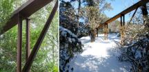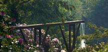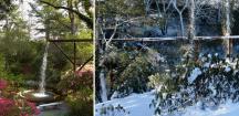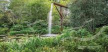 水景的選址在野生的松櫟林山谷內(nèi),位于地勢(shì)較高的入口平臺(tái)和較低的萱草花園之間。山谷內(nèi)種植有高大的白櫟、黑櫟、鐵山、松樹、山毛櫸等喬木和杜鵑花等下層植物和地被蕨。為了在搭建過程中,保證重型機(jī)械不傷害周邊樹冠、下層植物和地被植物,設(shè)計(jì)師使用了高科技的可伸縮安裝方式。