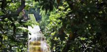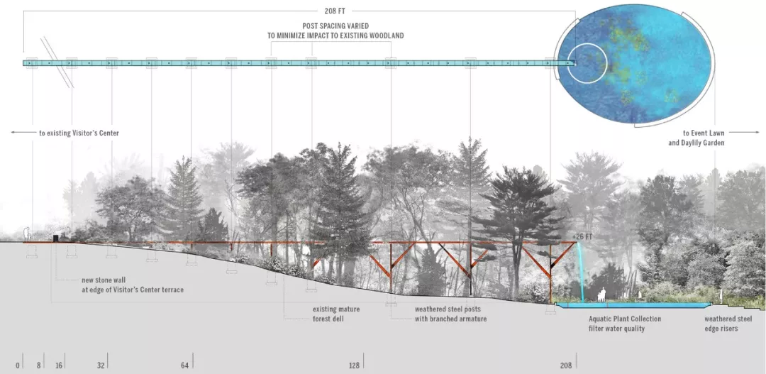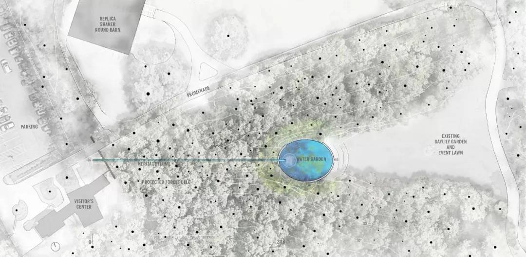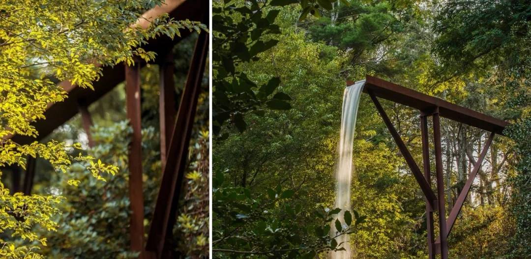 靜止的水平面倒映著樹冠倒影和天上的云彩,并為森林里的鳥類和野生動(dòng)物提供水源。內(nèi)層溢出來的水流到外層的管道,通過水渠來到最東端的出口,形成26英尺(約8米)高的瀑布,傾瀉到下方的萱草花園。管道的建設(shè)簡(jiǎn)單、易于復(fù)制,并最小化對(duì)場(chǎng)地的干預(yù)和影響。