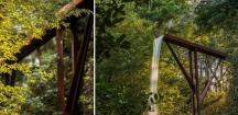 當(dāng)游客散步到萱草花園時(shí),便能清晰地看見隱藏在樹林中的水渠。傾斜的鋼結(jié)構(gòu)支撐物小心地避開樹木枝葉和林下層植被,與周圍的枝干形成對(duì)比。為了與自然的林地色彩相契合,裝置選用了耐候鋼作為架構(gòu)材料。