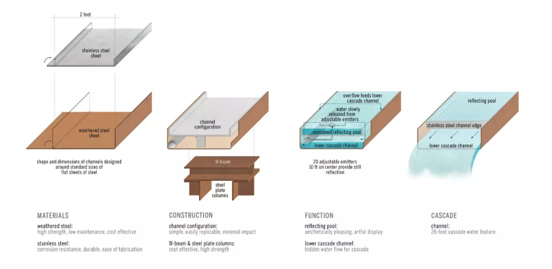 208英尺(約63.4米)長的水渠由兩個(gè)部分組成,內(nèi)層(上層)2英寸(約5厘米)深的不銹鋼水渠溢出的水流入外層的耐候鋼管道中。內(nèi)層的水時(shí)刻保持被填滿的狀態(tài),從而形成2英尺(約60厘米)寬的鏡面水渠。耐候鋼和不銹鋼的選用是考慮到了它們的低維護(hù)、高強(qiáng)度、成本效益和易于搭建的特點(diǎn)。