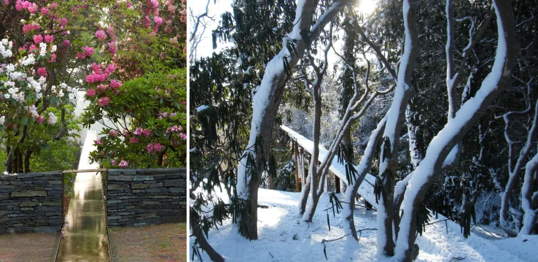 遺產(chǎn)博物館和花園邀請(qǐng)景觀設(shè)計(jì)師來設(shè)計(jì)一個(gè)能夠吸引游客并展示美國文化和歷史的水景。花園中的杜鵑花在美國有著重要意義,客戶希望能對(duì)其進(jìn)行保護(hù)和展示。與游客中心相鄰的露臺(tái)可以俯瞰廣闊且陡峭的深林山谷,是場(chǎng)地中唯一一塊可以兼顧高低兩個(gè)區(qū)域觀景體驗(yàn)的場(chǎng)地。