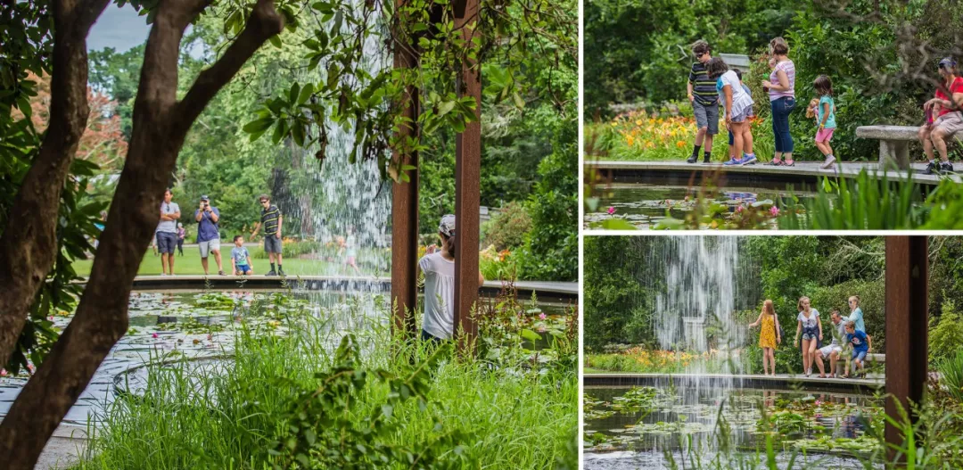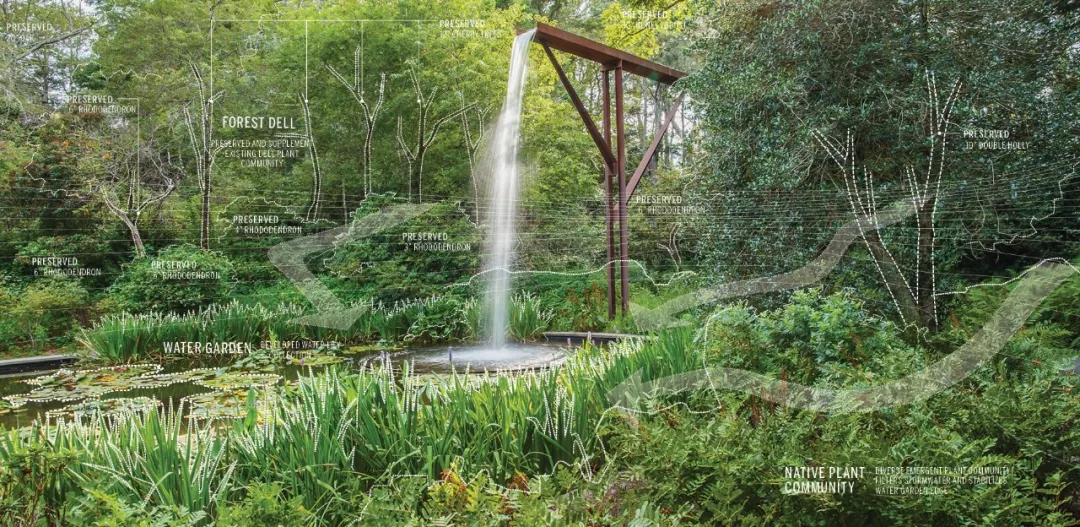 設(shè)計(jì)師將原來三分之一的萱草地劃分成冥想水池花園,水池中種植的睡蓮,不僅維護(hù)了水生態(tài)環(huán)境,而且為來訪者帶來更多的審美體驗(yàn)。植物配置中大量使用本土植物,提高林緣景觀品質(zhì)。所有新種植的植物均來自附近的苗圃。26英尺高的瀑布不僅供人欣賞,對(duì)于水池還有換氣功能。