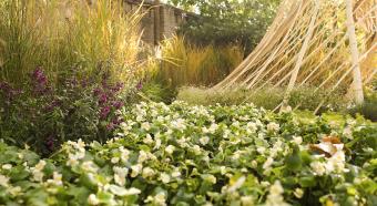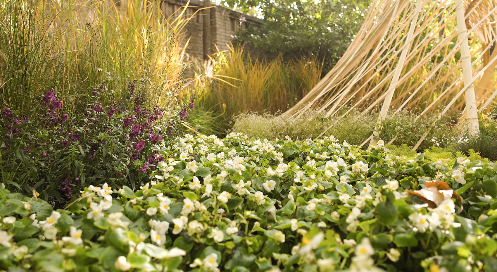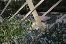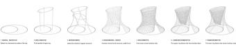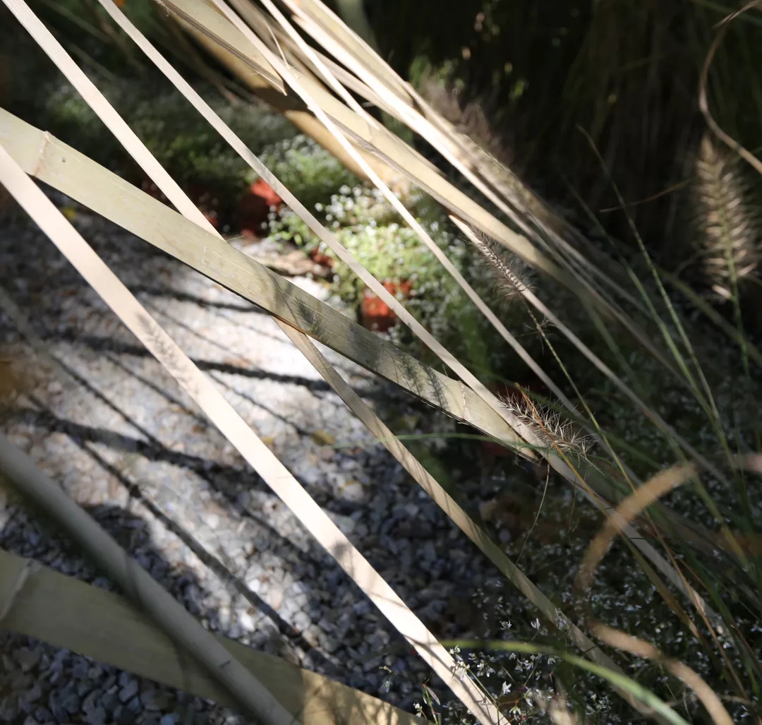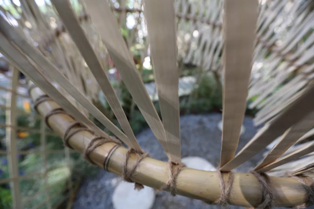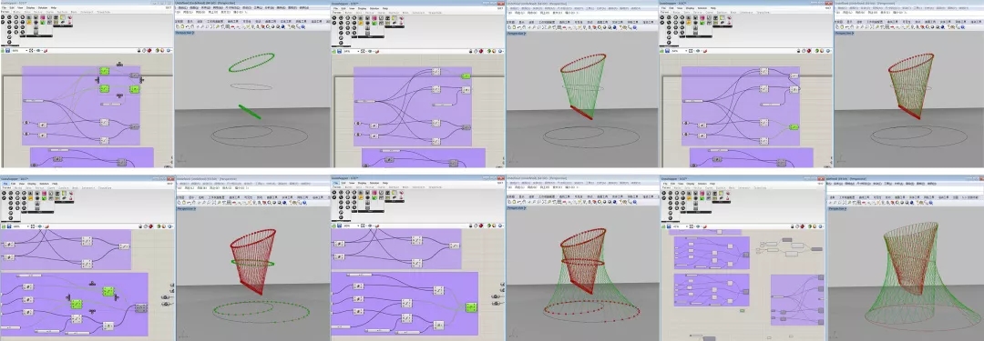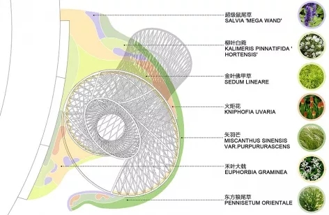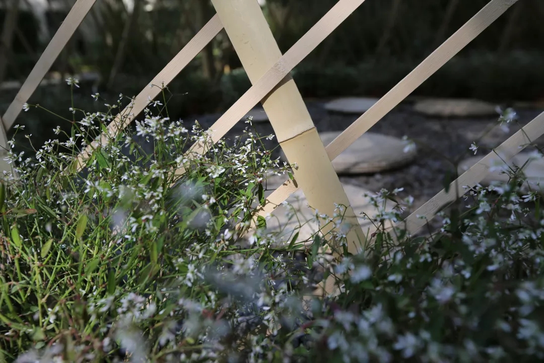 在現(xiàn)場(chǎng)搭建中,考慮到竹子的自然特性,團(tuán)隊(duì)保留了頂部部分延伸的竹材以及拼接的編織竹篾,賦予了整個(gè)構(gòu)筑自由隨性“生長”的生命力。在花園的意境營造上,考慮到竹材樸素的特性,采用高大的狼尾草和矢羽芒進(jìn)一步圍合,形成隱秘而爛漫的沉思空間。底部一周環(huán)繞星星點(diǎn)點(diǎn)的小白花——“星際爆炸禾葉大戟”,仿佛滿地都是墜落下來的繁星。入口處點(diǎn)綴著的橙色火炬花和深藍(lán)鼠尾草,兩者互為對(duì)比色,形成跳躍活潑的氛圍。為了能更精準(zhǔn)地確定編織所需的竹材數(shù)量以及產(chǎn)生的光影效果,團(tuán)隊(duì)采用grasshopper結(jié)合rhino來進(jìn)行模型的搭建,經(jīng)過十多次的調(diào)整而確定了最終方案。