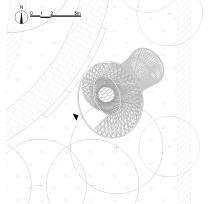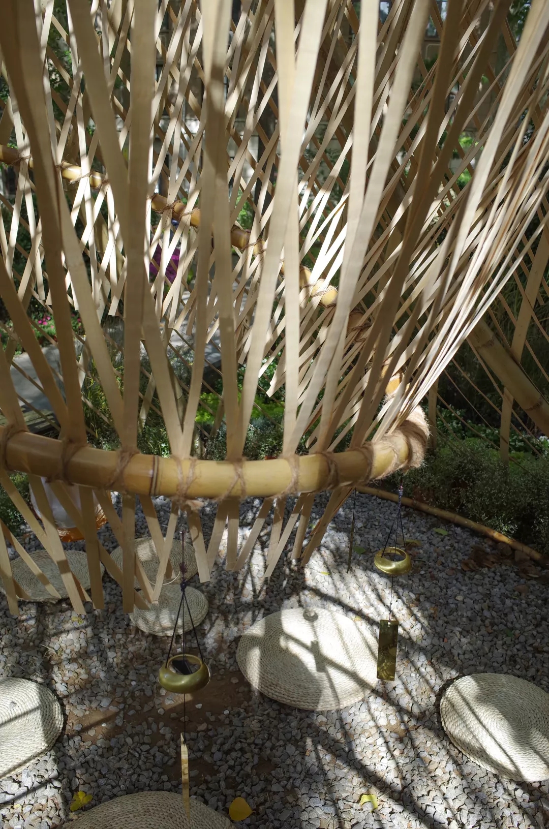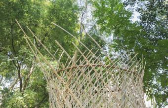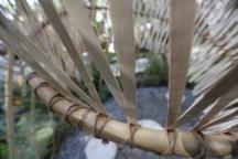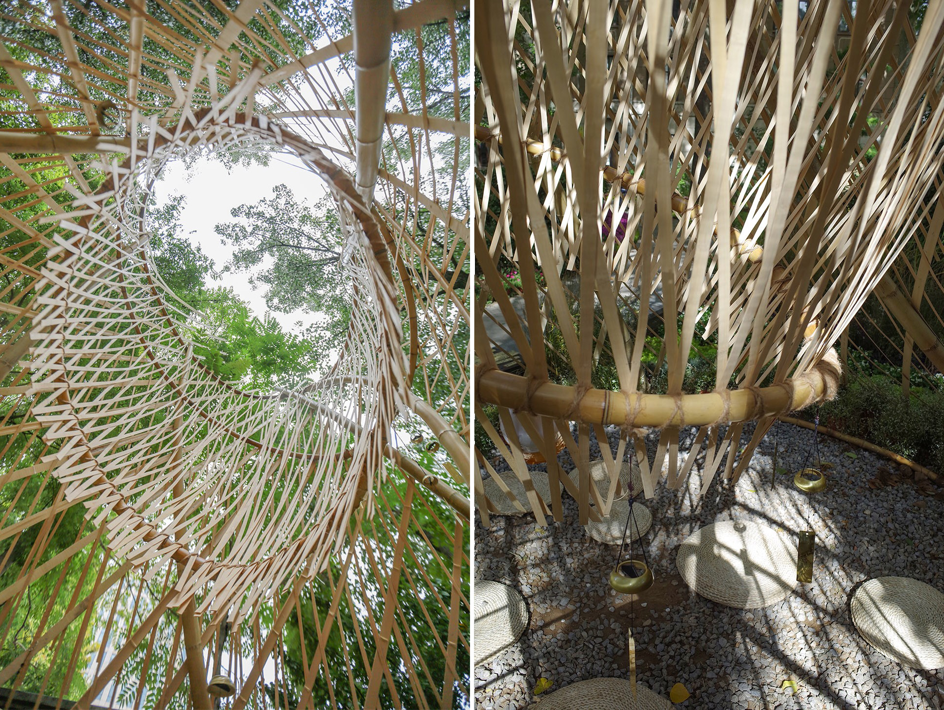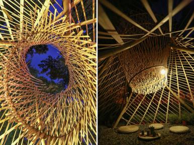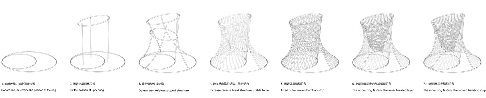 為了創(chuàng)造一種“吸引力”,整個(gè)構(gòu)筑采用一個(gè)扭曲的形式,分為里外兩層結(jié)構(gòu)。在外層,主要承重結(jié)構(gòu)為六根向同一方向扭轉(zhuǎn)的彎曲毛竹。在與毛竹扭轉(zhuǎn)相反的方向上,使用較為密集的竹片進(jìn)行拉壓桿固定,形成穩(wěn)定的網(wǎng)架筒體結(jié)構(gòu)。上中下各采用一個(gè)圓環(huán)進(jìn)行整體圈梁固定。最外層利用輕薄的竹篾進(jìn)行表皮紋理的交錯(cuò)編織,塑造整體輕盈感,豐富光影變化。內(nèi)層為一懸掛的交叉編織的“黑洞”,連接頂部圓環(huán)和人視點(diǎn)高度的傾斜圓環(huán),形成更加圍合的觀景空間,讓人忍不住想鉆進(jìn)洞里,抬頭仰望浩渺星河。