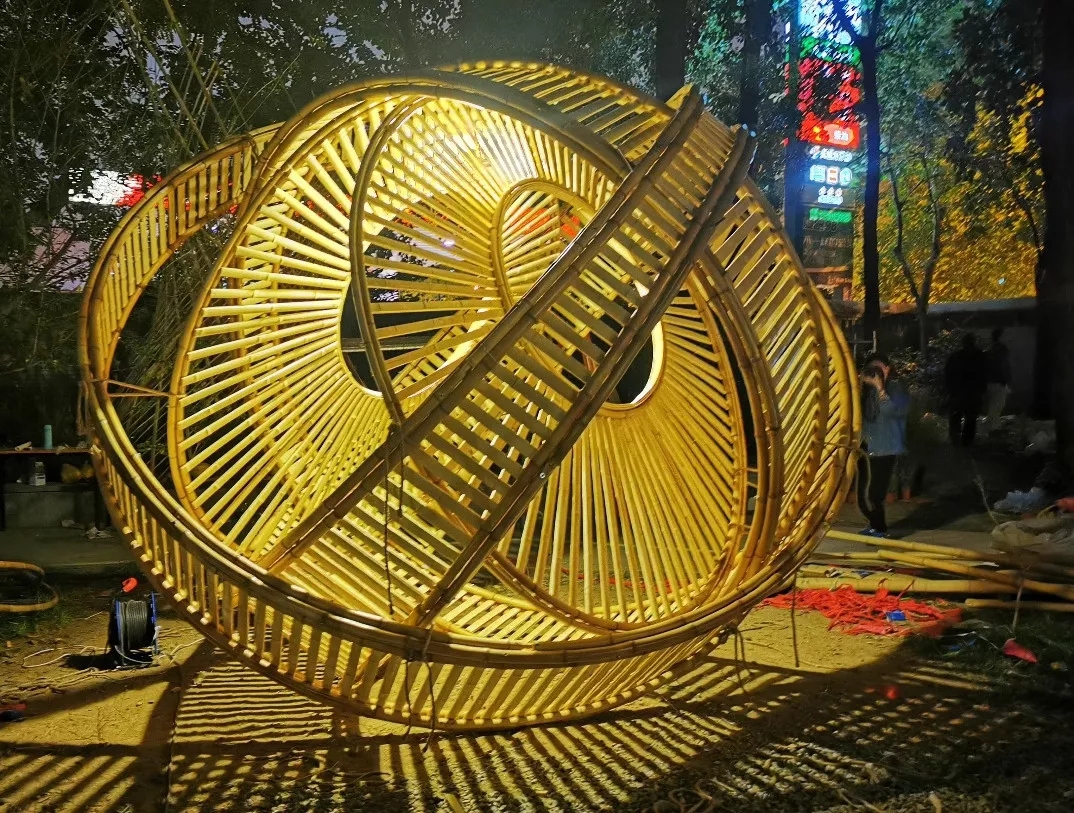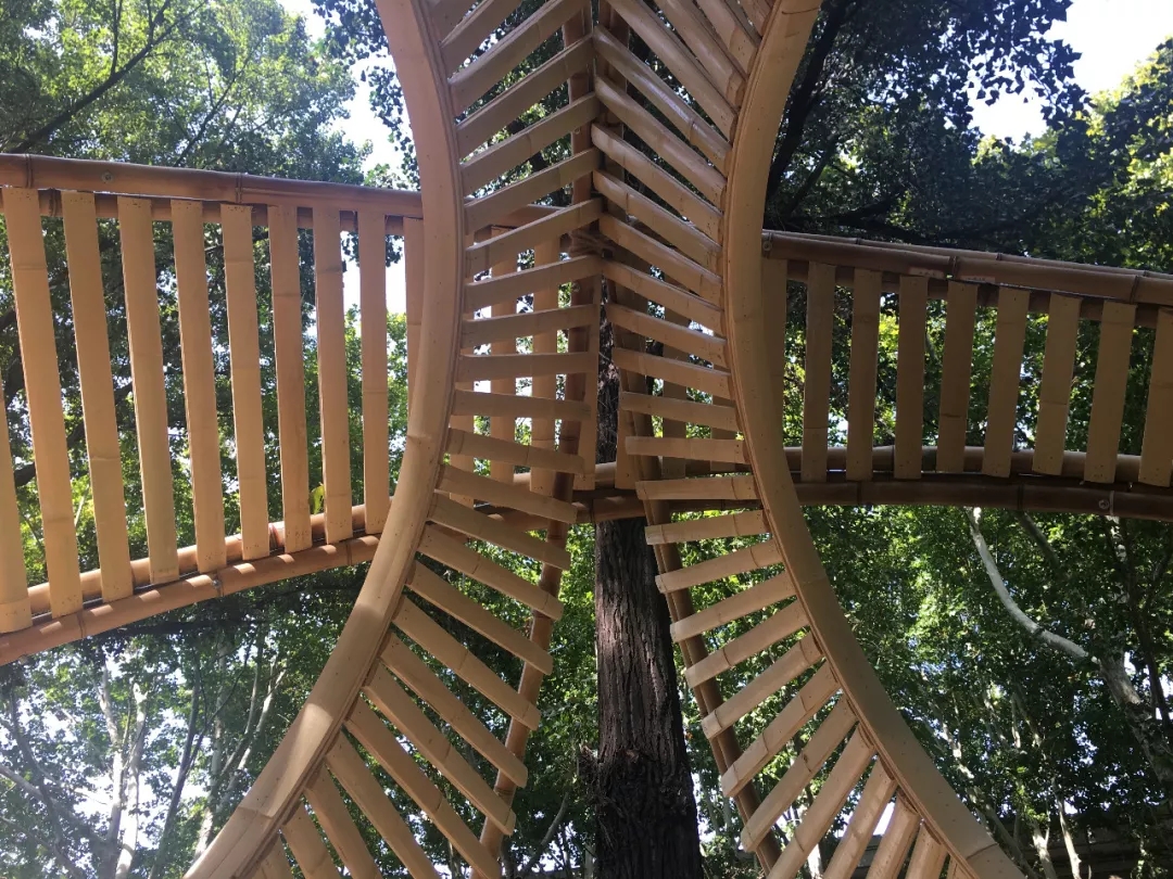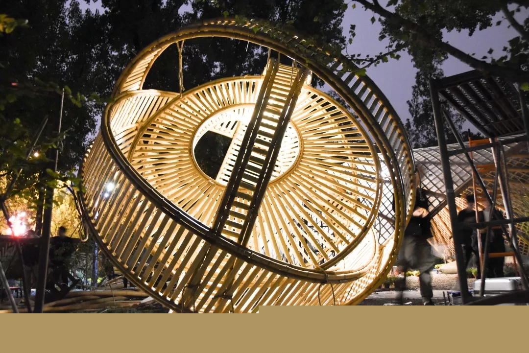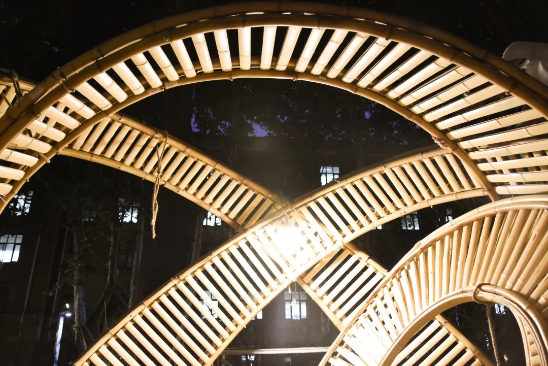 竹構(gòu)設(shè)計(jì)的形態(tài)來(lái)源于中國(guó)古代張衡改進(jìn)的渾天儀,團(tuán)隊(duì)成員提取渾天儀中的圓環(huán)要素,將三個(gè)圓環(huán)通過(guò)穿插、重復(fù)的方式組織在一起。三環(huán)在地面形成的三角形具有穩(wěn)定性,可不借助外力直接接地,對(duì)場(chǎng)地的破壞最小。外層圓環(huán)采用平行陣列的方式形成肌理,內(nèi)層圓片采用中心放射的方式形成肌理,交相輝映,構(gòu)建多層次的空間,形成詩(shī)意的光影效果。