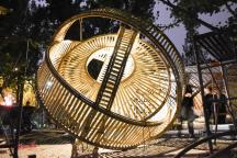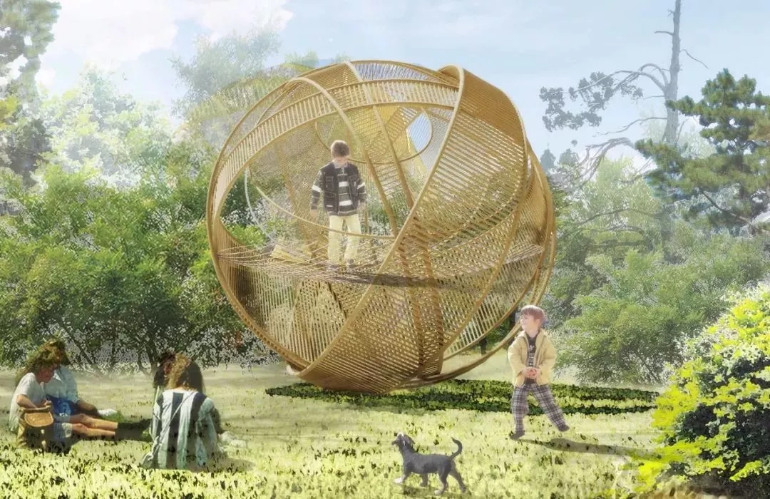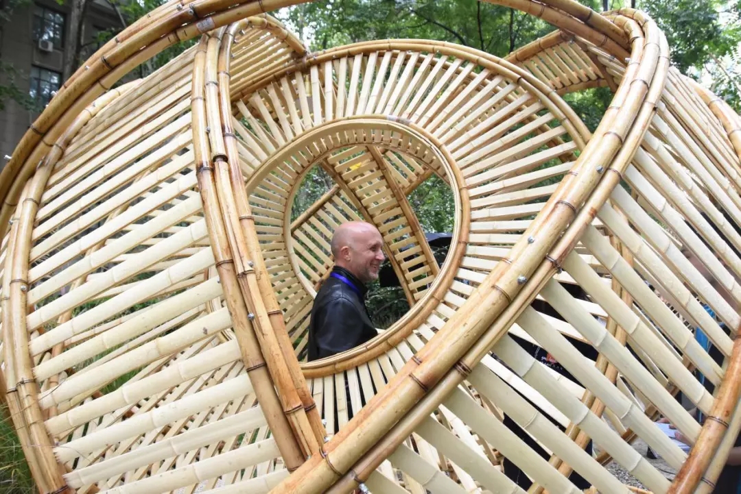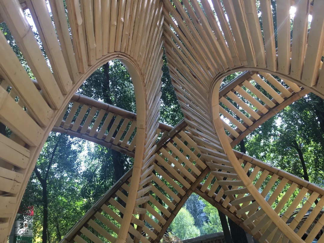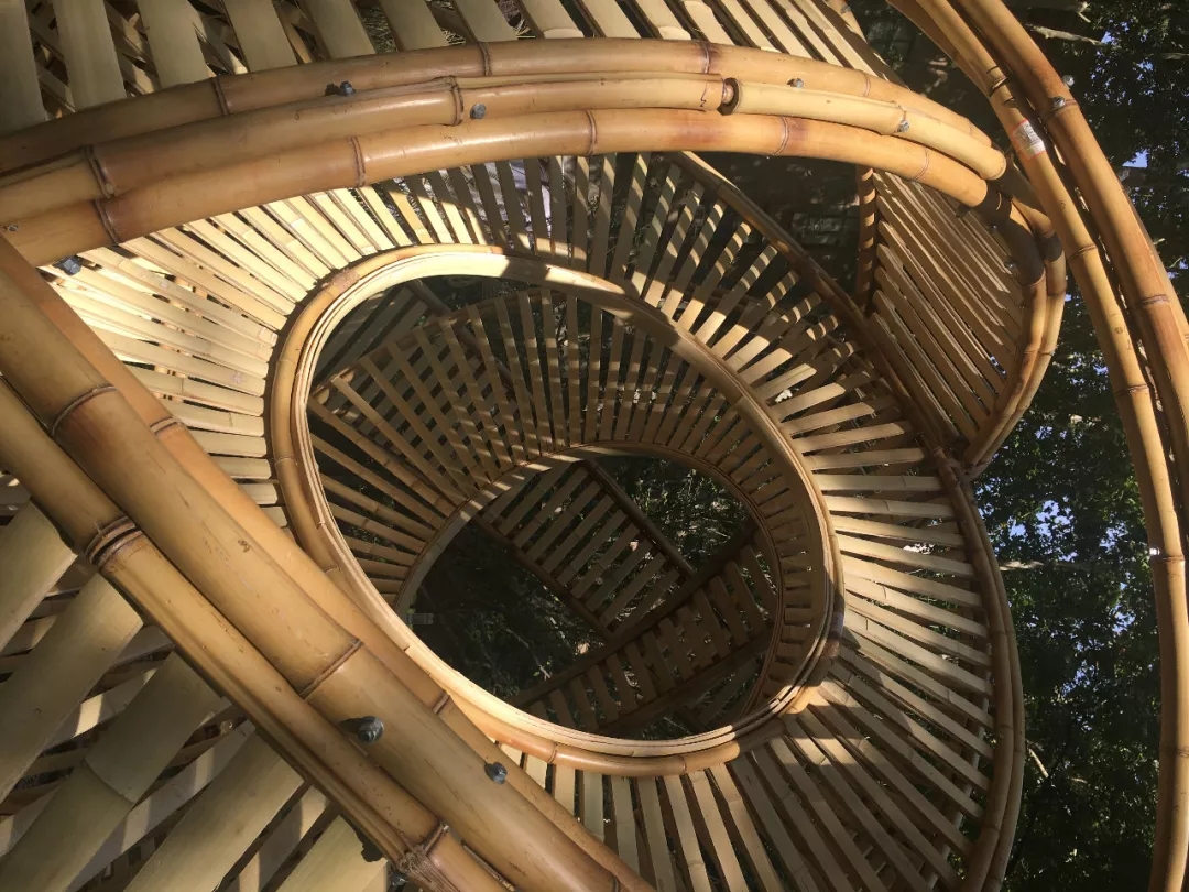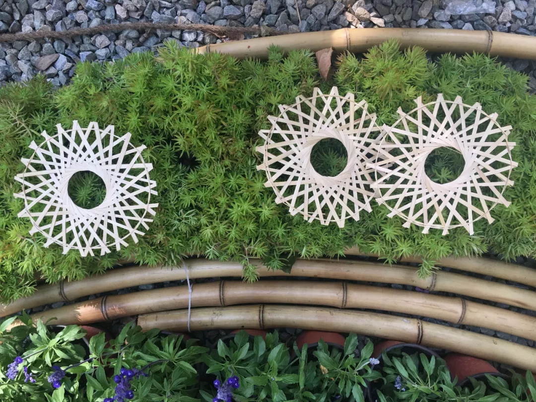竹構(gòu)設(shè)計(jì)的形態(tài)來(lái)源于中國(guó)古代張衡改進(jìn)的渾天儀,團(tuán)隊(duì)成員提取渾天儀中的圓環(huán)要素,將三個(gè)圓環(huán)通過(guò)穿插、重復(fù)的方式組織在一起。三環(huán)在地面形成的三角形具有穩(wěn)定性,可不借助外力直接接地,對(duì)場(chǎng)地的破壞最小。外層圓環(huán)采用平行陣列的方式形成肌理,內(nèi)層圓片采用中心放射的方式形成肌理,交相輝映,構(gòu)建多層次的空間,形成詩(shī)意的光影效果。