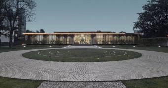 “千尺絲綸直下垂,一波才動萬波隨。夜靜水寒魚不食,滿船空載月明歸”為唐代高僧船子德誠禪師有一首偈,講到真正能讓心靈歸宿、靈魂安憩的不是那物質(zhì)與財富;也不是那高天廣宇,是明山凈水,晨鐘暮鼓,古卷青燈,參禪修行;而是放下執(zhí)著,萬緣隨心,寧靜澹泊,無欲無求的空明自在。本方案靈感來源于這首偈“一波才動萬波隨”。以圓心向外延展,形似水波,層層向外極具有延伸性和包容感的空間設(shè)計,表達(dá)了“一念既起,萬念相隨”的佛家思想,與建筑一起營造出一種空無的靈境。