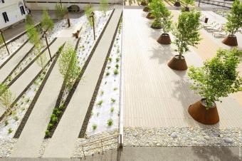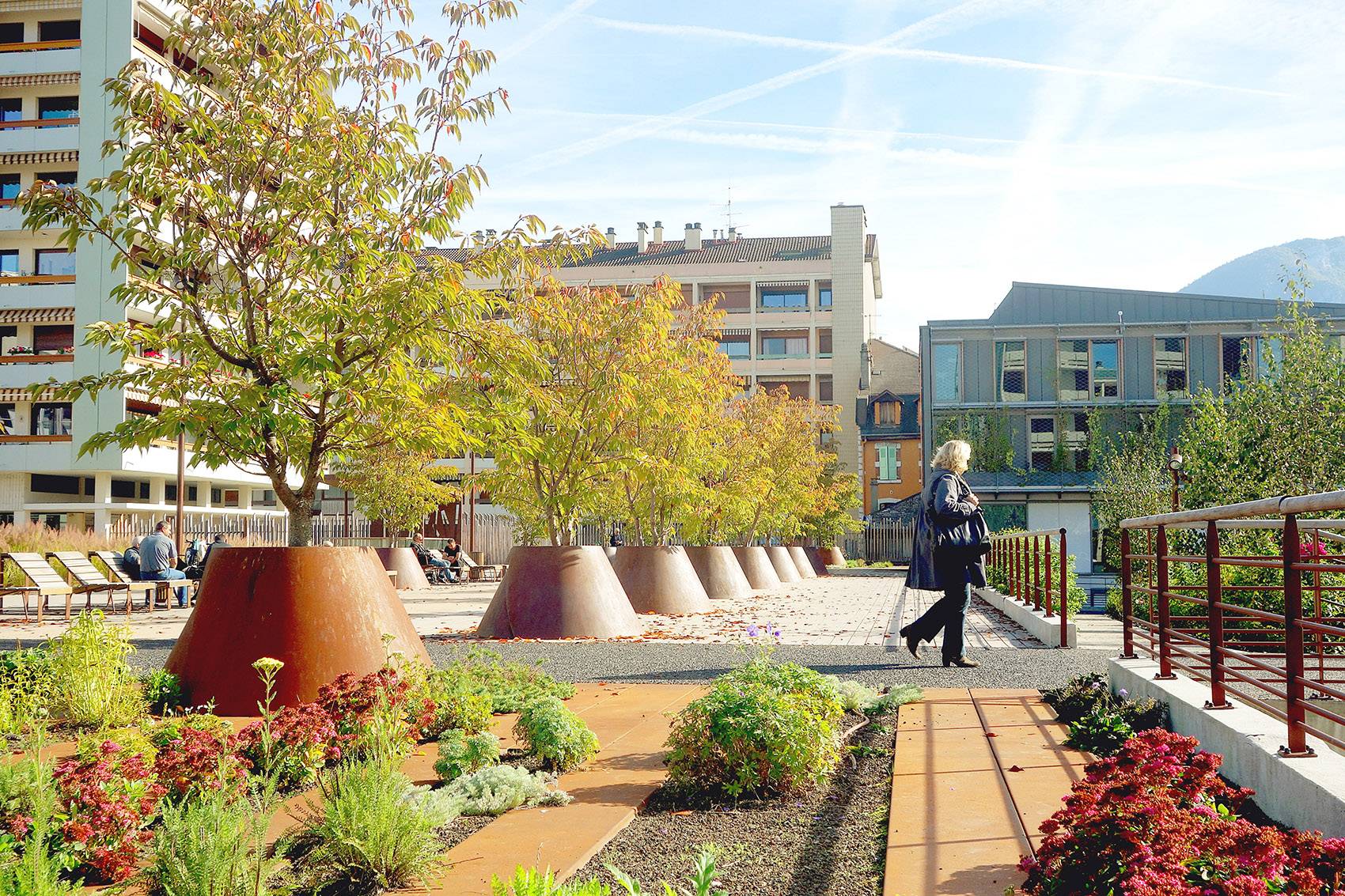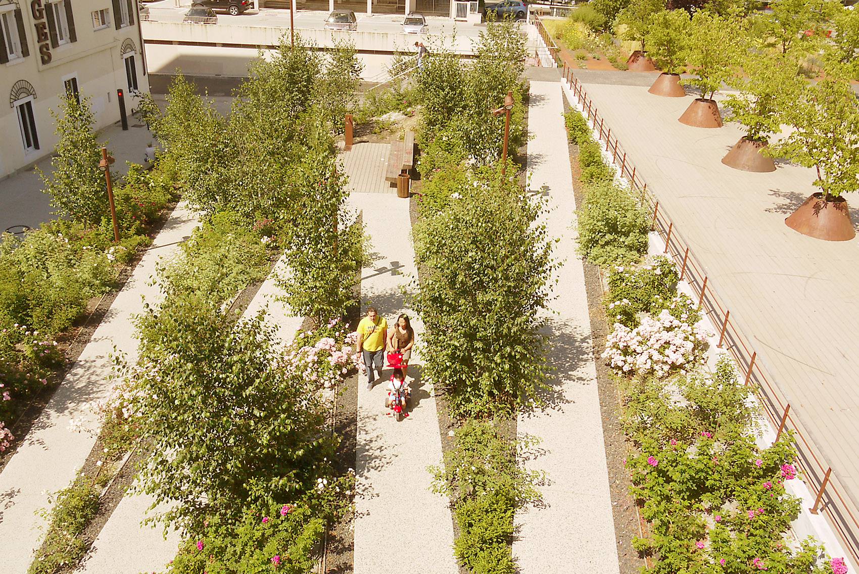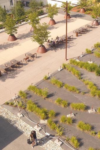 第三個(gè)空間將場(chǎng)地的高低兩端連接在一起。這是一個(gè)建造在停車場(chǎng)空間上方的玫瑰花園,起到了良好的掩蔽作用。花園中的植物與步行斜坡相互交織,使人想起山區(qū)里曲折而陡峭的鋪路。