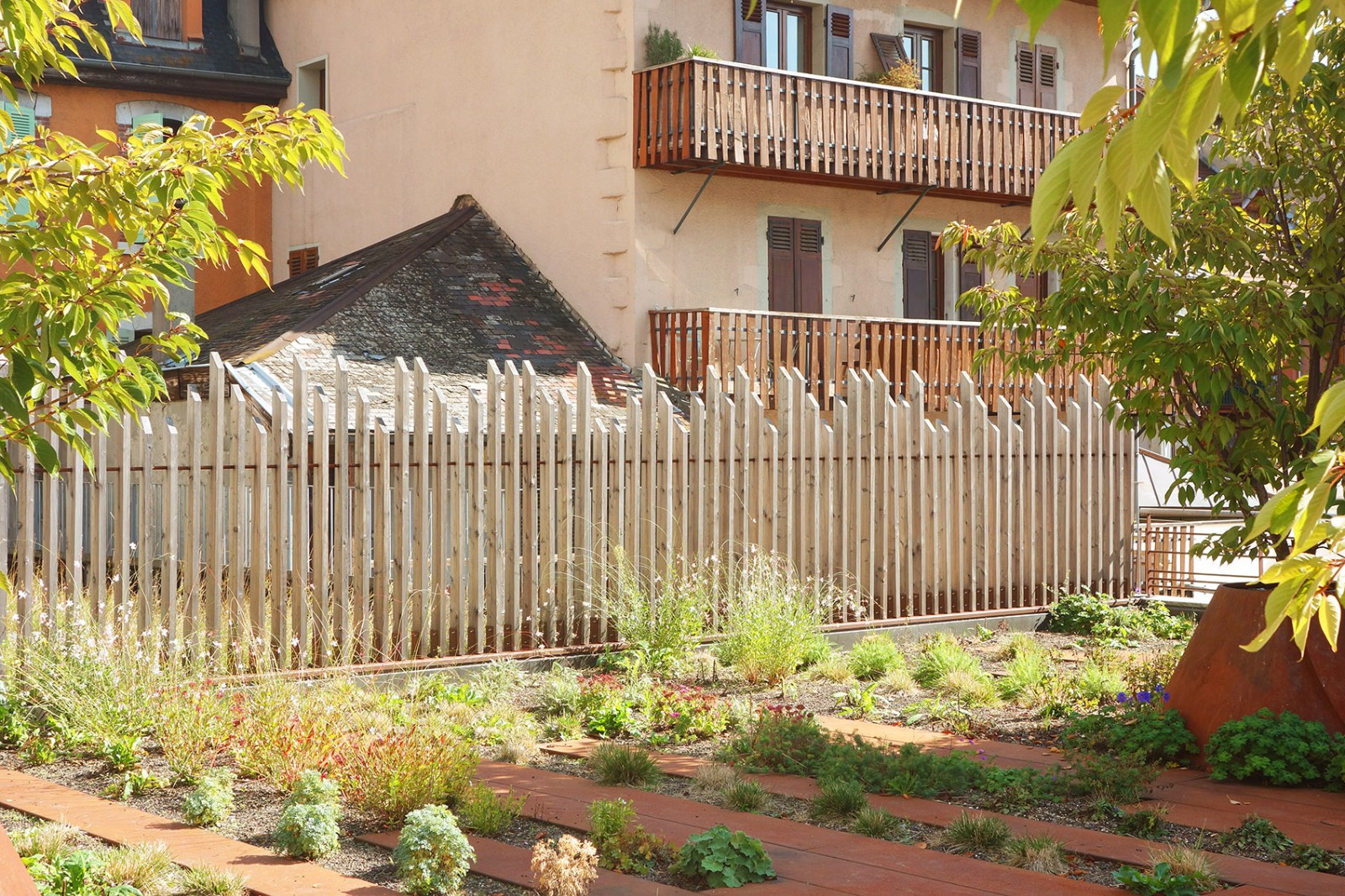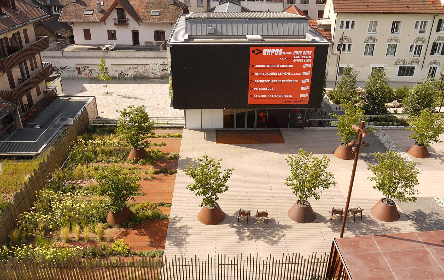 廣場(chǎng)南面是寬闊的矩形平臺(tái),也是整個(gè)項(xiàng)目的“心臟”所在。抬升的地勢(shì)使其能夠?yàn)閺V場(chǎng)引入Semnoz山和Bornes山的美景,帶來(lái)類似于山頂餐廳露臺(tái)的氛圍,在晴朗的天氣里深受滑雪者們的喜愛(ài)。