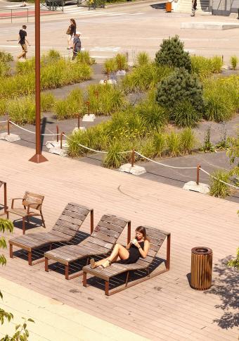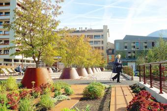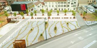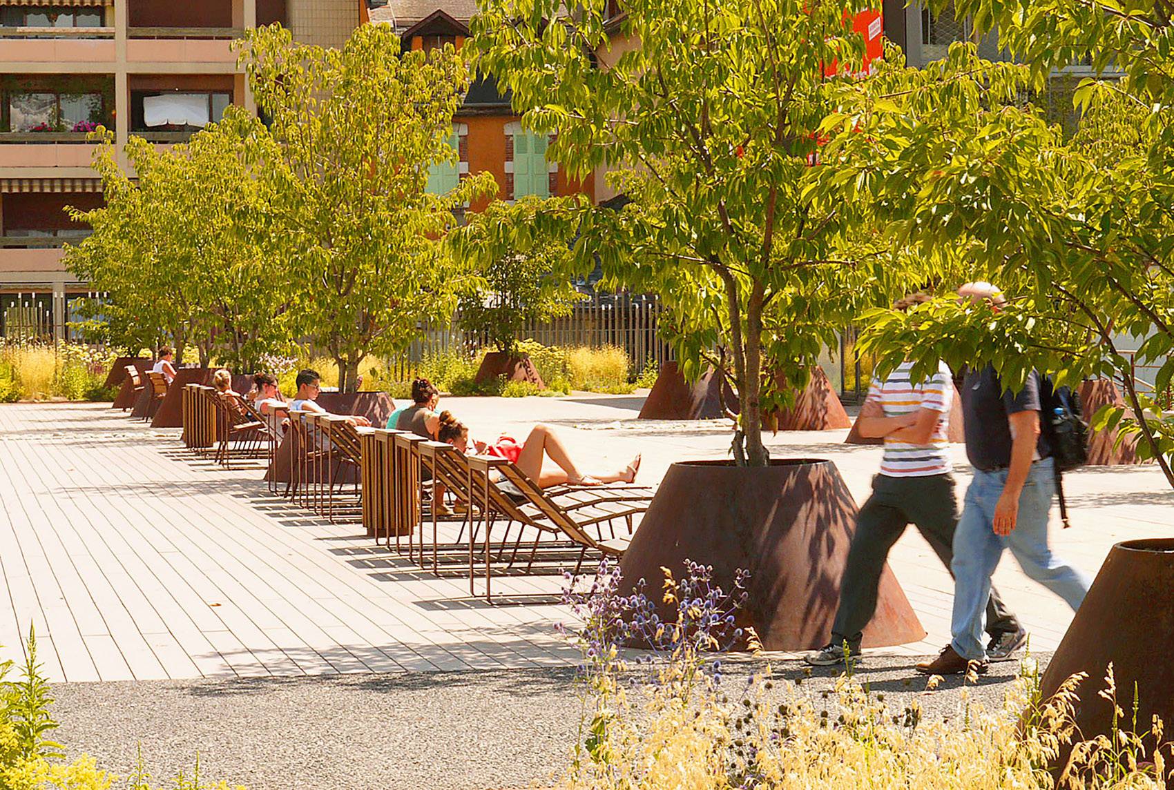 在一個(gè)原本沒(méi)有記憶點(diǎn)的混凝土廣場(chǎng)上,景觀設(shè)計(jì)師通過(guò)對(duì)周圍環(huán)境的細(xì)致感知而為之續(xù)寫了新的故事。設(shè)計(jì)的目的是讓舊廣場(chǎng)成為一個(gè)能夠展現(xiàn)四季山地美景的、受到市民、游客和滑雪愛(ài)好者歡迎的場(chǎng)所。